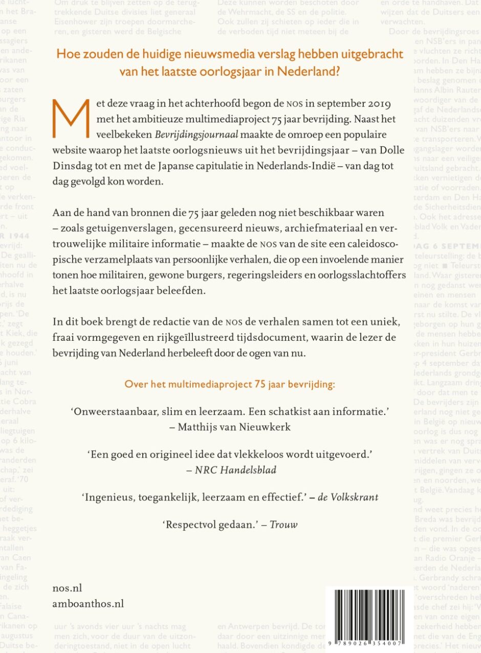 In dit boek brengt de redactie van NOS de verhalen samen tot een uniek, fraai vormgegeven, en rijk geïllustreerd tijdsdocument, waarin de lezer de bevrijding van Nederland herbeleeft met de kennis van toen, maar door de ogen van nu.