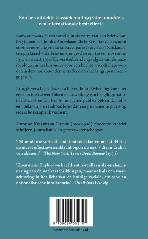Adres onbekend dat voor het eerst in druk verschenen in 1938 in de Verenigde Staten, toonde al vroeg de werking van het gif van het nationaalsocialisme aan het Amerikaanse publiek. Het boek is inmiddels uitgegroeid tot een internationale bestseller. Kathrine Kressmann Taylor (1903-1996) doceerde creatief schrijven, journalistiek en geesteswetenschappen.
