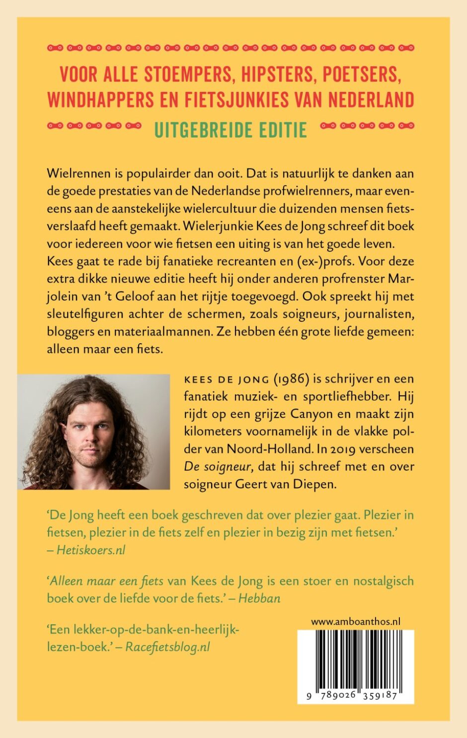 Om na te gaan wat het leven als fietser precies inhoudt gaat Kees te rade bij (ex-)profs als Laurens ten Dam, Thomas Dekker, Karsten Kroon en Mathieu van der Poel, en spreekt hij met sleutelfiguren achter de schermen: soigneurs, journalisten, bloggers en materiaalmannen. Alleen maar een fiets van Kees de Jong is een stoer en nostalgisch boek over de liefde voor de fiets. In deze uitgebreide editie wordt ook aandacht besteed aan vrouwenwielrennen. Hoe heeft de vrouwentak van de sport zich ontwikkeld in de afgelopen jaren en waar zit ruimte voor verbetering? BEAT, een profploeg waar recreanten ook lid van kunnen worden, tilehunting/tegels fietsen; verdeel de landkaart in digitale hokjes van 1 vierkante mijl en probeer er daarvan zoveel mogelijk gefietst te hebben, en hoe corona de fiets/sport-ervaring heeft beïnvloed en dat nog altijd doet.