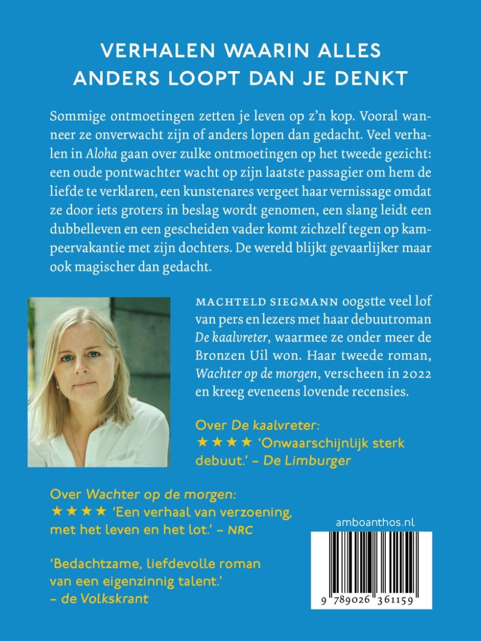In Aloha onderzoekt Machteld Siegmann de lichte en de donkere kant van de menselijke zoektocht naar verbinding. Een enkele ontmoeting kan je leven op z’n kop zetten. Vooral de onverwachte ontmoetingen, die anders lopen dan je denkt. Veel van de verhalen in Aloha gaan over zulke ontmoetingen-op-het-tweede-gezicht: een oude pontwachter wacht op zijn laatste passagier om hem de liefde te verklaren, een kunstenares vergeet haar vernissage omdat ze door iets groters in beslag wordt genomen, een slang leidt een dubbelleven en een gescheiden vader komt zichzelf tegen op kampeervakantie met zijn dochters. Gelukkig maar: de wereld is gevaarlijker maar ook magischer dan gedacht. Aloha is het nieuwe boek van Machteld Siegmann, auteur van De kaalvreter en Wachter op de morgen.