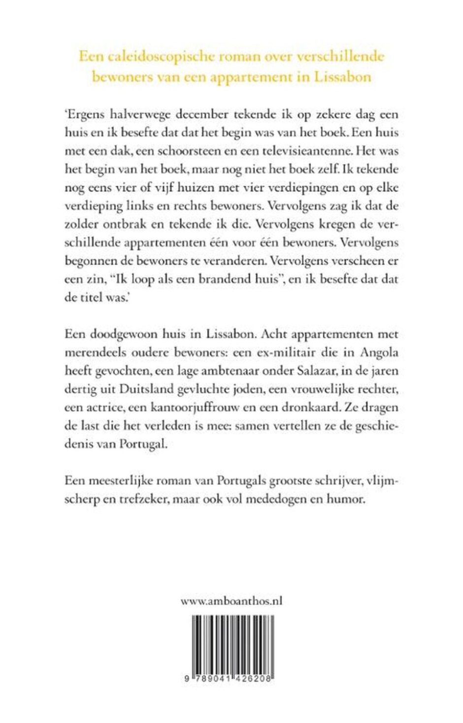 De Portugese schrijver António Lobo Antunes heeft met 'Als een brandend huis' opnieuw een meesterwerk geschreven. De roman speelt zich af in de stad Lissabon. Acht appartementen met merendeels oudere bewoners: een ex-militair die in Angola heeft gevochten, een kleine ambtenaar onder Salazar, in de jaren dertig uit Duitsland gevluchte joden, een vrouwelijke rechter, een actrice, een kantoorjuffrouw en een dronkaard. Ze dragen de last die het verleden is mee: samen vertellen ze de geschiedenis van Portugal. Een meesterlijke roman van António Lobo Antunes, Portugals grootste schrijver, vlijmscherp en trefzeker, maar ook vol mededogen en humor.