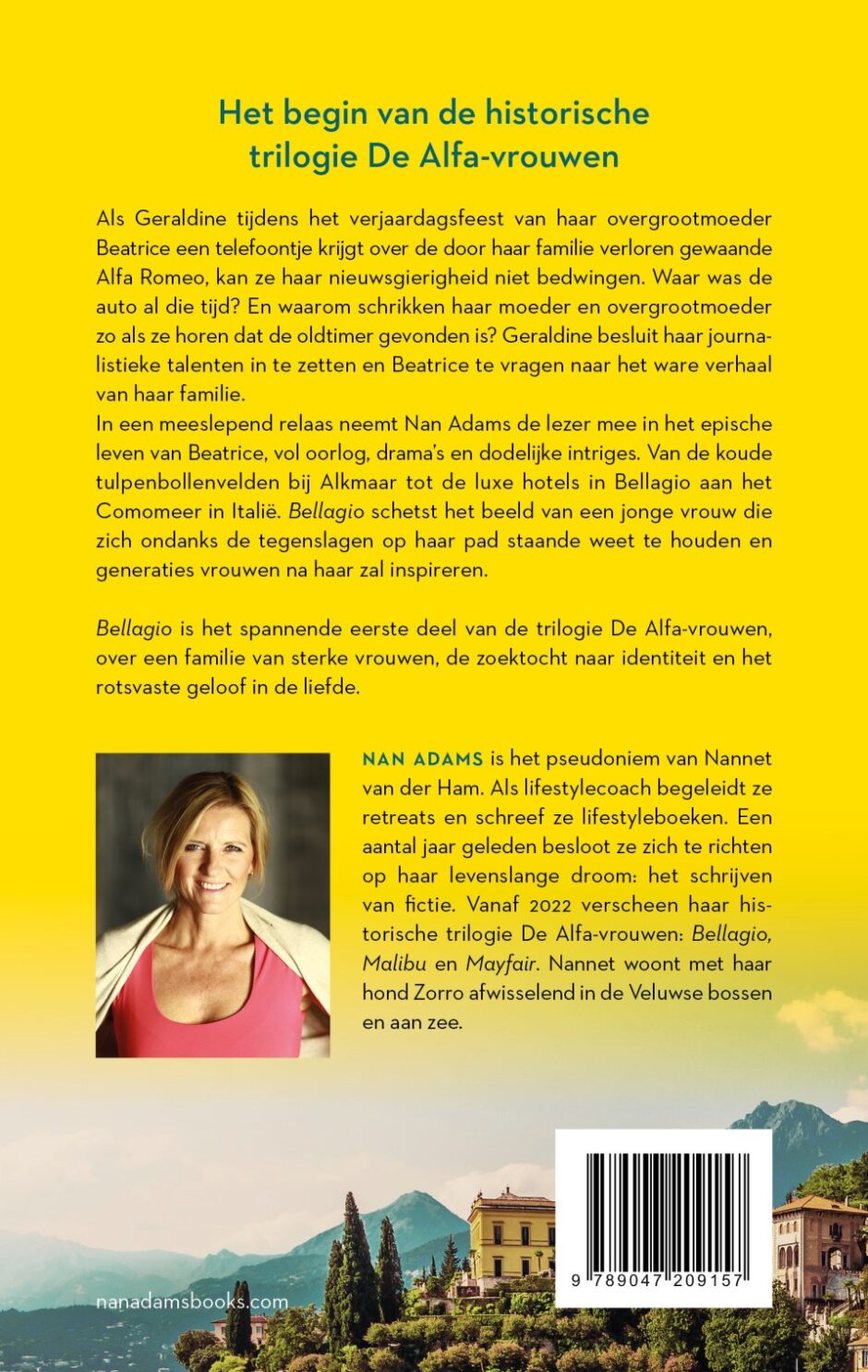 Nan Adams neemt de lezer mee door het epische leven van Beatrice, vol oorlogsdrama’s en dodelijke intriges. Van de tulpenvelden bij Alkmaar tot de luxe hotels in Bellagio aan het Comomeer in Italië, Bellagio schetst het leven van de jonge Beatrice, die zich ondanks tegenslagen staande weet te houden en generaties vrouwen inspireert.