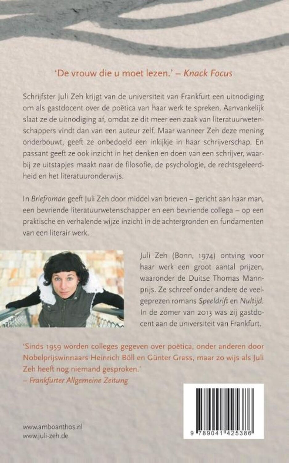 In 'Briefroman' geeft Juli Zeh, een van de meest toonaangevende Europese schrijvers van dit moment, een inkijkje in haar schrijverschap. Zeh is bekend van haar romans 'Speeldrift' en 'Nultijd' en ontving voor haar werk een groot aantal prijzen. Door middel van brieven gericht aan haar man, een bevriende literatuurwetenschapper en een bevriende collega geeft ze op een praktische en verhalende wijze inzicht in de manier waarop haar literatuur tot stand komen. Daarnaast gaat 'Briefroman' in op het denken en doen van een schrijver, waarbij ze uitstapjes maakt naar de filosofie, de psychologie, de rechtsgeleerdheid en het literatuuronderwijs.