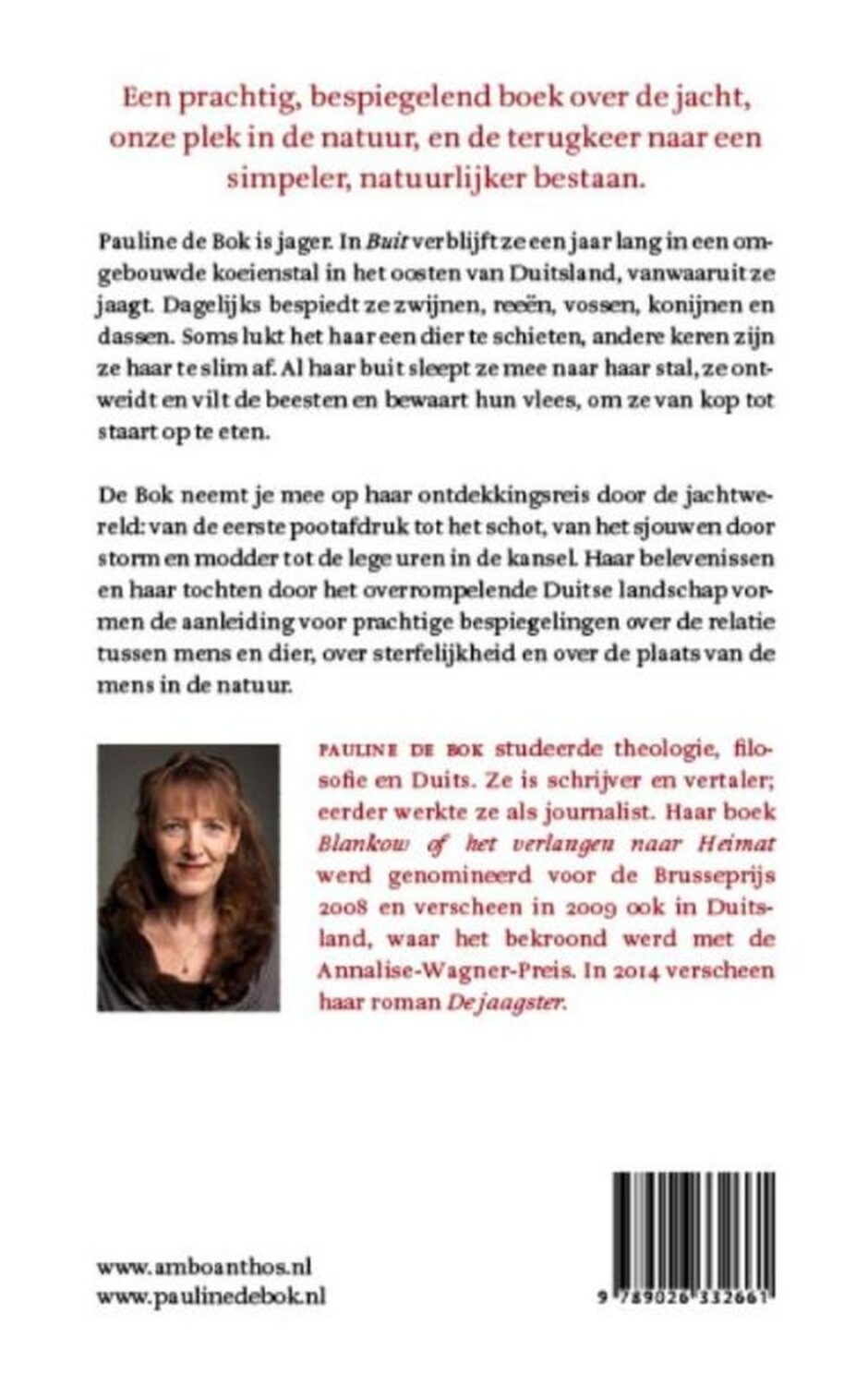 De Bok neemt je mee op haar ontdekkingsreis door de jachtwereld: van de eerste pootafdruk tot het schot, van het sjouwen door storm en modder tot de lege uren in de kansel. Haar belevenissen en haar tochten door het overrompelende Duitse landschap vormen de aanleiding voor prachtige bespiegelingen over de relatie mens-dier, over sterfelijkheid en over de plaats van de mens in de natuur.