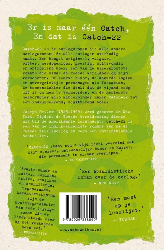 In november 1961, nu bijna vijftig jaar geleden, verscheen een recensie in de Herald Tribune over `een woeste, ontroerende, schokkende, dolkomische, razende, opbeurende, reuzenroetsjbaan van een boek. The Times voorspelde even later dat mensen die het konden verteren het niet licht zouden vergeten: `Een verbluffende prestatie, die vrijwel evenveel lezers zal schokken als verrukken. De rest is geschiedenis: Joseph Heller (1923-1999), die tijdens de Tweede Wereldoorlog diende bij de Amerikaanse luchtmacht, schreef met Catch-22 een van de belangrijkste en indrukwekkendste oorlogsromans die uitgroeide tot een klassieker. De zwarte humor, de absurde logica en onvergetelijke personages als Yossarian, de bommenrichter die denkt dat de vijand erop uit is hem te vermoorden, en de gewiekste messofficier Milo Minderbinder, maken Catch-22 tot een onvergetelijk boek.