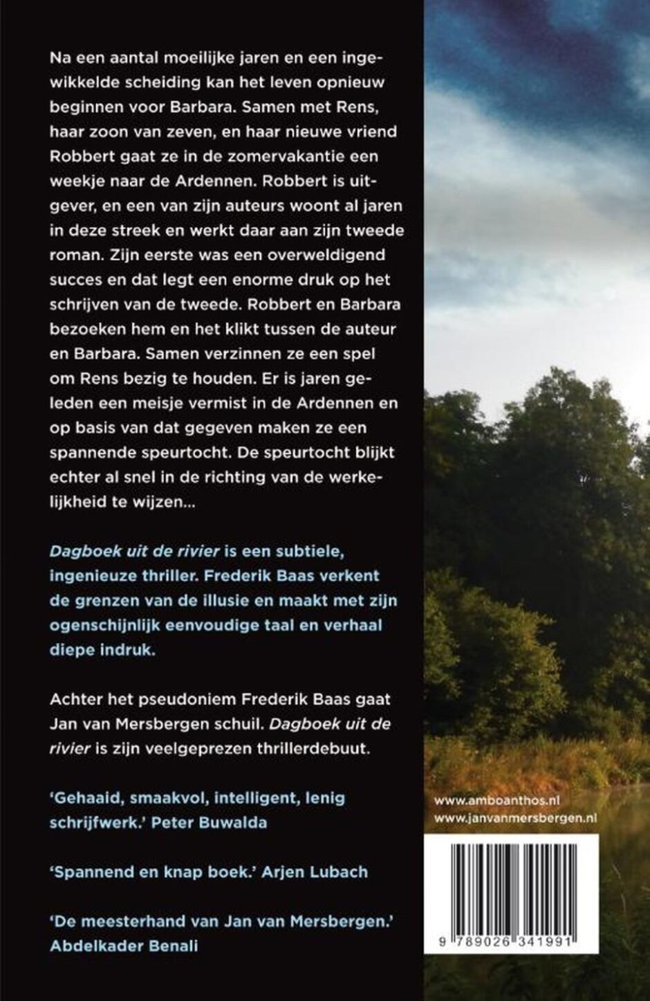 Dagboek uit de rivier van Frederik Baas is een subtiele, ingenieuze thriller. Frederik Baas is een pseudoniem van Jan van Mersbergen, die eerder onder andere Naar de overkant van de nacht en De laatste ontsnapping schreef. Naar de overkant van de nacht werd genomineerd voor de Libris Literatuurprijs en won de BNG Nieuwe Literatuurprijs.