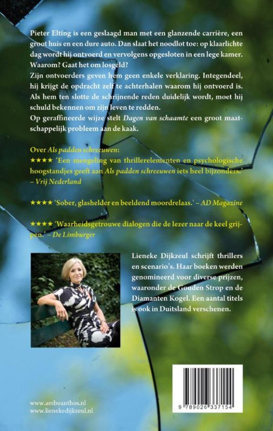 ‘Dagen van schaamte’ is de nieuwste thriller van de Nederlandse Henning Mankell: Lieneke Dijkzeul, auteur van ‘De geur van regen’, ‘Wat overblijft’ en ‘Als padden schreeuwen’. ‘Dagen van schaamte’ is een verhaal over onmacht en eenzaamheid, vol psychologische spanning. Pieter Elting is een geslaagd man: glanzende carrière, groot huis, dure auto. Dan slaat het noodlot toe: op klaarlichte dag wordt hij ontvoerd en vervolgens opgesloten in een lege kamer. Hoewel hij ervan overtuigd is dat hij daar nooit eerder is geweest, komt de plek hem toch bekend voor. Maar waarom is hij hier? Zijn ontvoerders geven hem geen verklaring. Integendeel, hij krijgt de opdracht er zelf achter te komen. Als hem ten slotte de schrijnende reden duidelijk wordt, bekent hij schuld, maar alleen om zijn leven te redden. De boeken van Lieneke Dijkzeul werden genomineerd voor diverse prijzen, waaronder de Gouden Strop en de Diamanten Kogel.