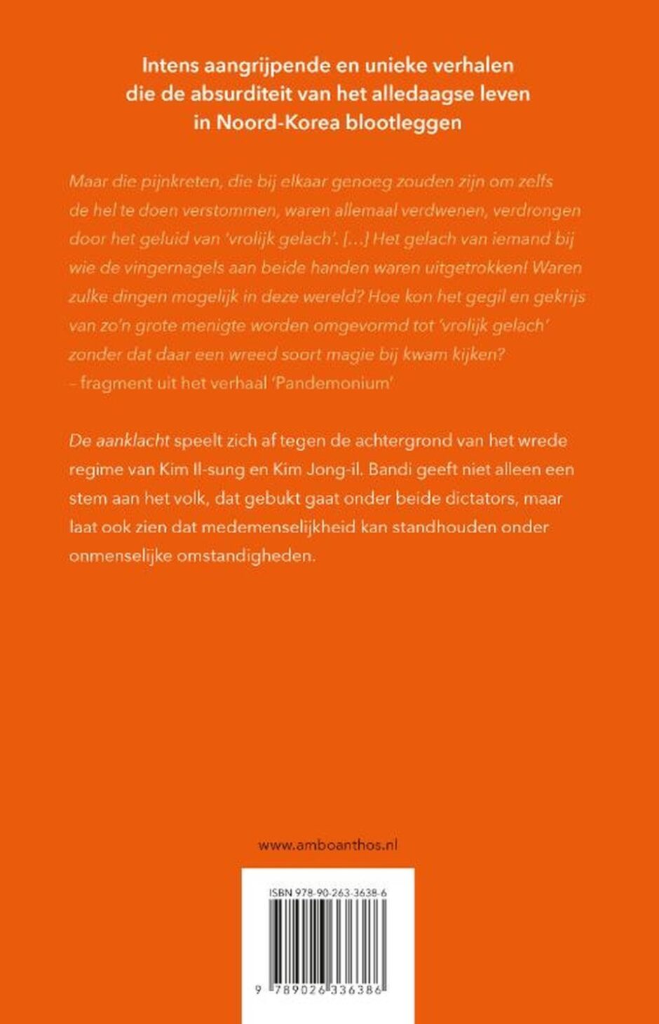 Met rauwe precisie, absurde satire en onverwachte schoonheid neemt Bandi in De aanklacht de lezer mee naar het Noord-Korea van de jaren 90, tijdens het repressieve regime van Kim Il-Sung, naar personages van vlees en bloed met hartverscheurende verhalen.