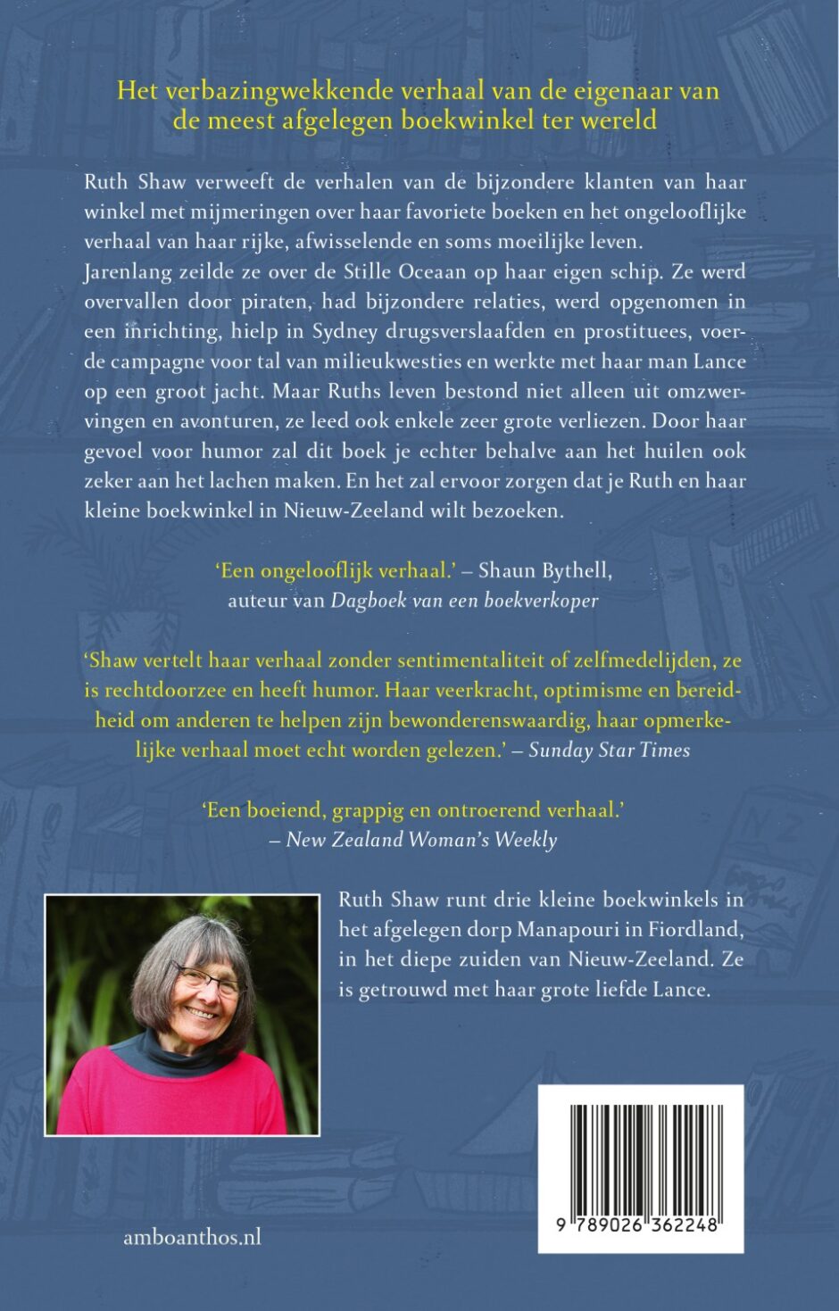 In De boekwinkel aan het eind van de wereld lees je de hartverscheurende memoires van Ruth Shaw, een charmante boekhandelaar uit het afgelegen dorp Manapouri, in het diepe zuiden van Nieuw-Zeeland. Ruth verweeft de verhalen van de bijzondere klanten van haar winkel met mijmeringen over haar favoriete boeken en het ongelooflijke verhaal van haar rijke, afwisselende en soms moeilijke leven. Ze zeilde jarenlang over de Stille Oceaan, waar ze werd overvallen door piraten, had bijzondere relaties, werd opgenomen in een inrichting, hielp in Sydney drugsverslaafden en prostituees, voerde campagne voor tal van milieukwesties en werkte met haar man Lance op een groot jacht. Ruths leven bestond niet alleen uit omzwervingen en avonturen, ze leed ook enkele zeer grote verliezen. Door haar gevoel voor humor zal dit boek je behalve aan het huilen ook zeker aan het lachen maken. En het zal ervoor zorgen dat je Ruth en haar kleine boekwinkel wilt bezoeken.