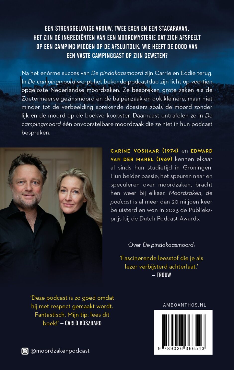 Na het enorme succes van hun debuut De Pindakaasmoord zijn Carrie en Eddie terug. in De Campingmoord werpt het bekende podcastduo hun licht op veertien opgeloste Nederlandse moordzaken. Ze bespreken grote zaken als de Zoetermeerste gezinsmoord en de balpenzaak en ook kleinere, maar niet minder tot de verbeelding sprekende dossiers zoals de moord zonder lijk en de moord op de boekverkoopster.