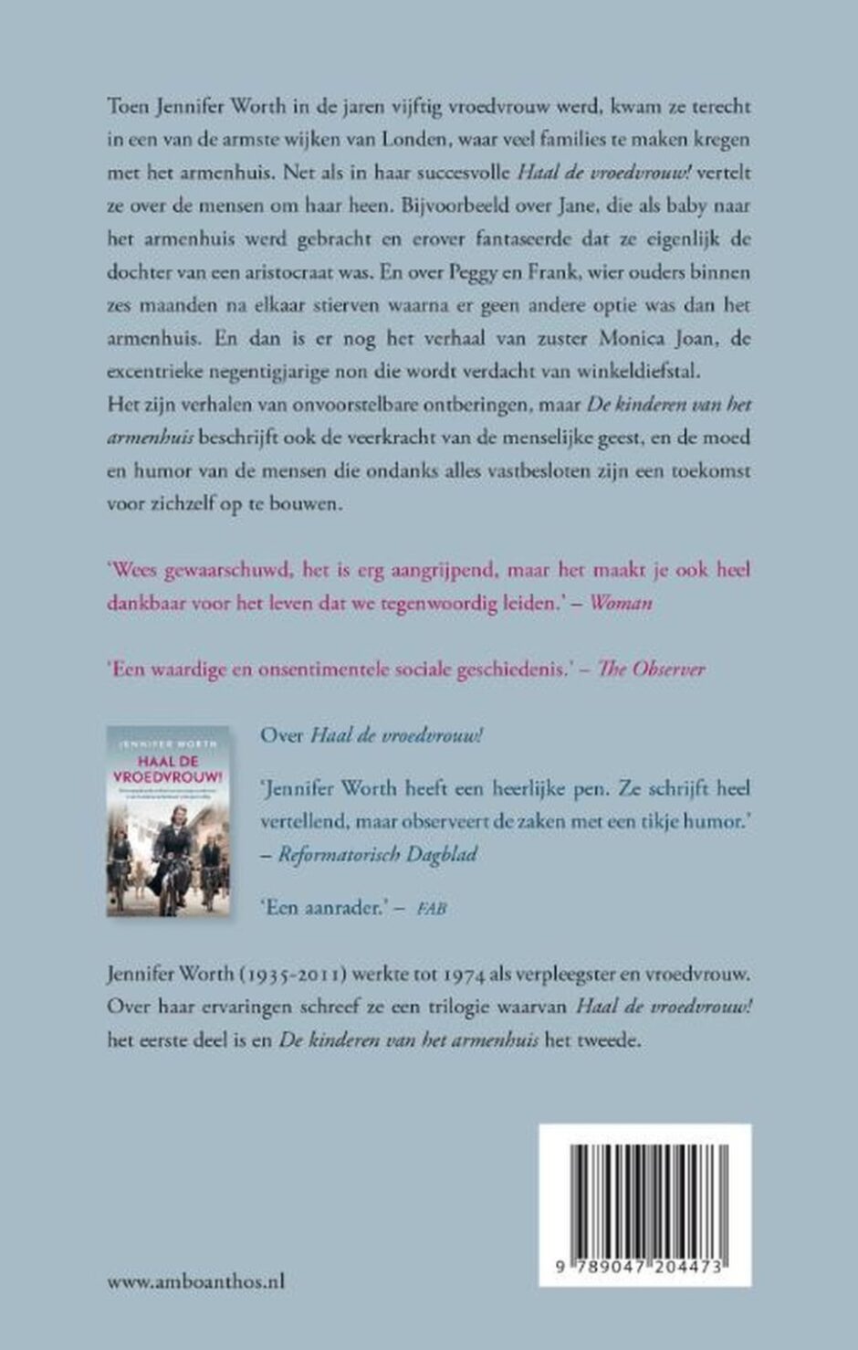 Jennifer Worth (in de tv-serie `Call the Midwife Jenny Lee), die in de jaren vijftig vroedvrouw was in de East End van Londen, vertelt in dit vervolg op `Haal de vroedvrouw! nog meer verhalen over de mensen met wie ze te maken kreeg. Zoals Peggy en Frank, wier ouders binnen zes maanden na elkaar stierven waarna er geen andere optie was dan het armenhuis. En zuster Monica Joan, de excentrieke oude non die wordt verdacht van winkeldiefstal. Het zijn verhalen van onvoorstelbare ontberingen, maar `De kinderen van het armenhuis is een boek over de veerkracht van de menselijke geest, en de moed en humor van de mensen die ondanks alles vastbesloten zijn een toekomst voor zichzelf op te bouwen.