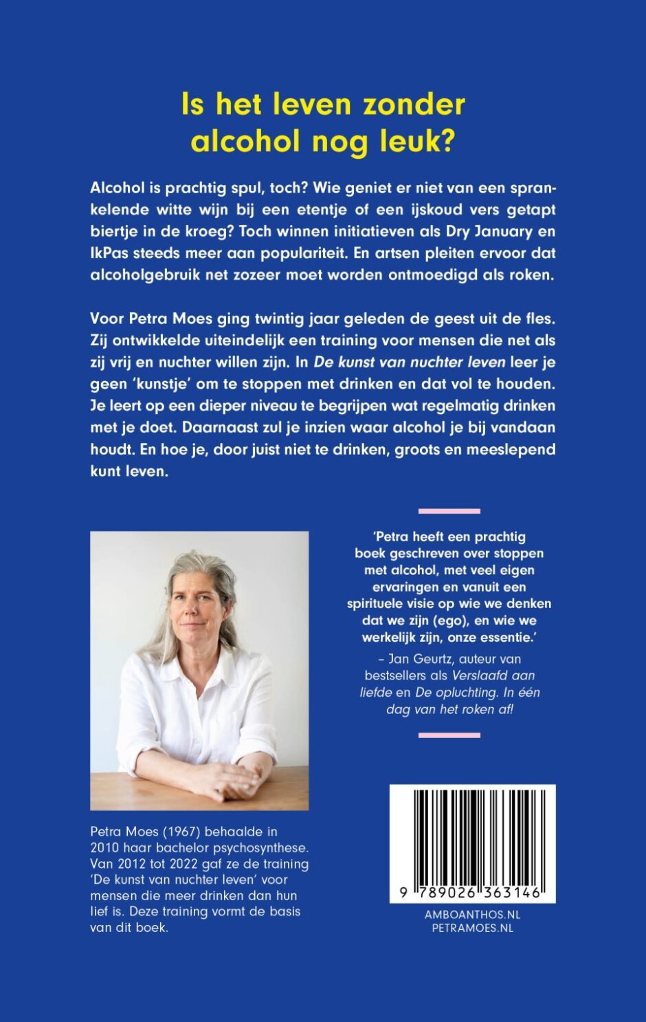 Voor Petra Moes ging twintig jaar geleden de geest uit de fles. Zij ontwikkelde een training voor mensen die net als zij vrij en nuchter willen zijn. De kunst van nuchter leven van Petra Moes leert je geen ‘kunstje’ om te stoppen met drinken en dat vol te houden. Je gaat op een dieper niveau begrijpen wat regelmatig drinken met je doet. Daarnaast leer je inzien waar alcohol je bij vandaan houdt. En hoe je, juist door niet te drinken, groots en meeslepend kunt leven.