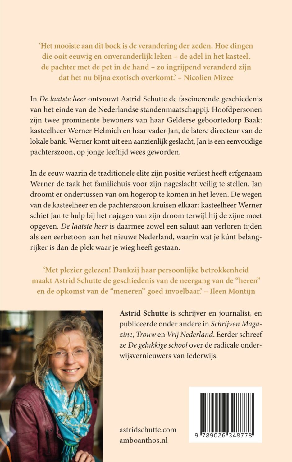 In De laatste heer ontvouwt Astrid Schutte de fascinerende geschiedenis van het einde van de Nederlandse standenmaatschappij. Hoofdpersonen zijn twee prominente bewoners van haar Gelderse geboortedorp Baak: kasteelheer Werner Helmich en haar vader Jan, de latere directeur van de lokale bank. Werner komt uit een aanzienlijk geslacht, Jan is een eenvoudige pachterszoon, op jonge leeftijd wees geworden.