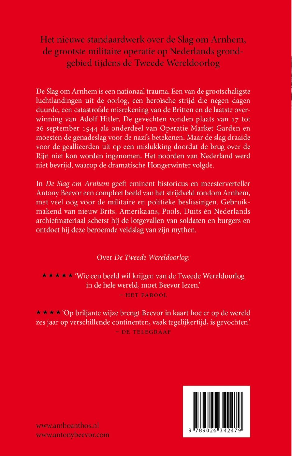 In De Slag om Arnhem geeft eminent historicus en meesterverteller Antony Beevor een compleet beeld van het strijdveld rondom Arnhem, met veel oog voor de militaire en politieke beslissingen. Gebruikmakend van nieuw Brits, Amerikaans, Pools, Duits én Nederlands archiefmateriaal schetst hij de lotgevallen van soldaten en burgers en ontdoet hij deze beroemde veldslag van zijn mythen.