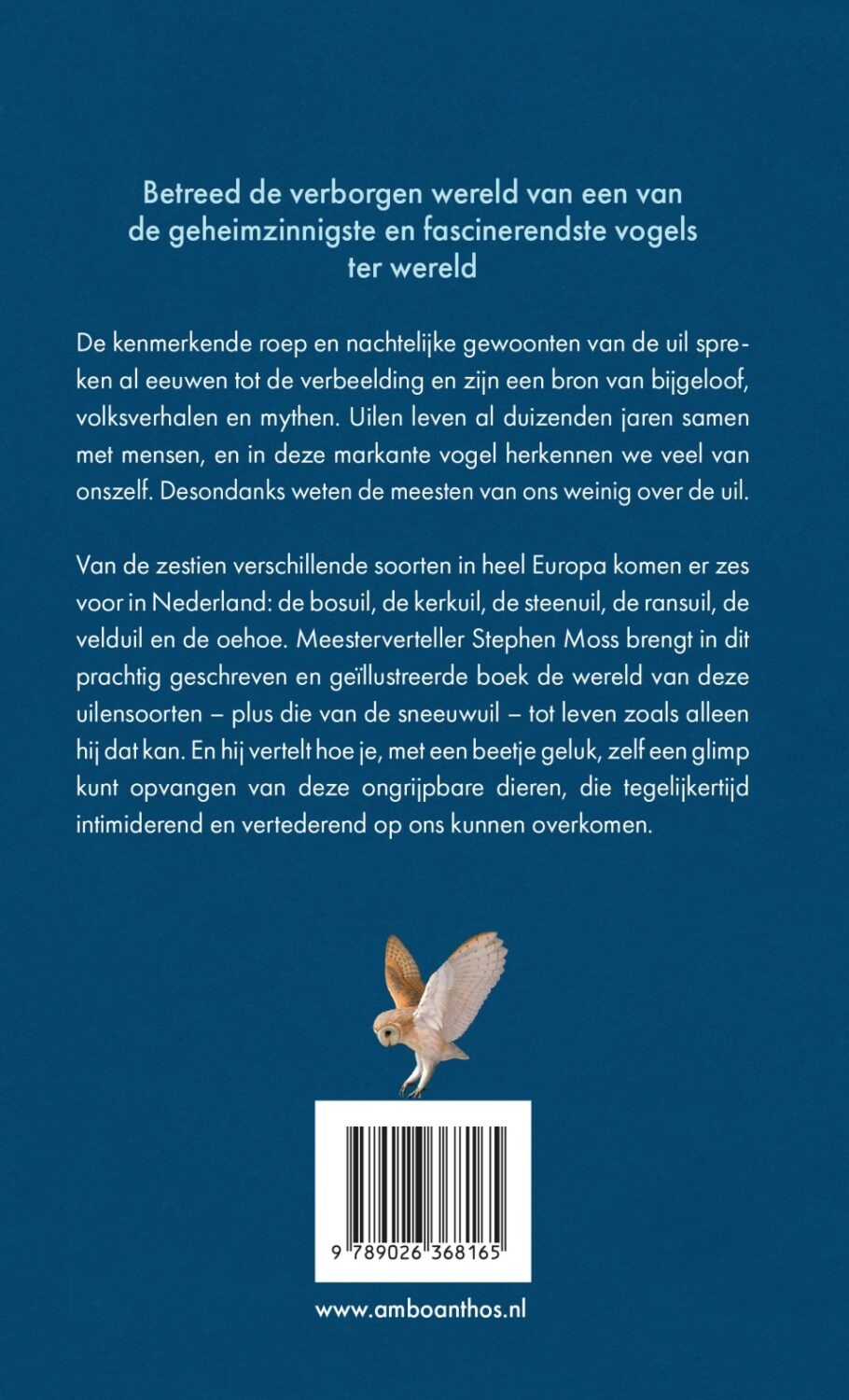 Van de zestien verschillende soorten in heel Europa komen er zes voor in Nederland: de bosuil, de kerkuil, de steenuil, de ransuil, de velduil en de oehoe. Meesterverteller Stephen Moss brengt in dit prachtig geschreven en geïllustreerde boek de wereld van deze uilensoorten – plus die van de sneeuwuil – tot leven zoals alleen hij dat kan. En hij vertelt hoe je, met een beetje geluk, zelf een glimp kunt opvangen van deze ongrijpbare dieren, die tegelijkertijd intimiderend en vertederend op ons kunnen overkomen.