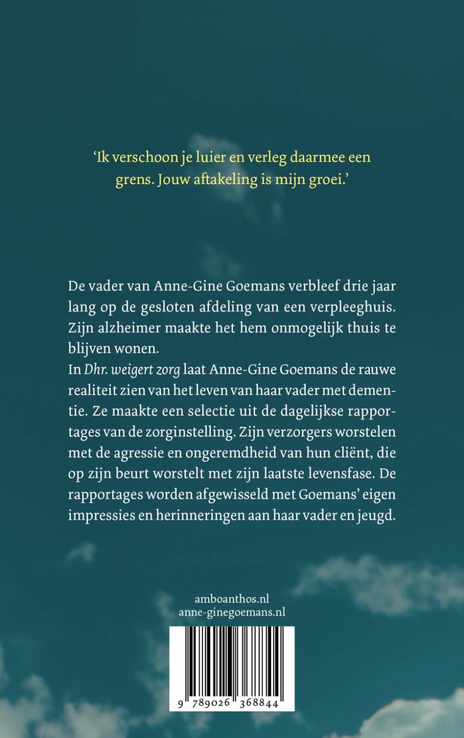 In Dhr. weigert zorg laat Anne-Gine Goemans de rauwe realiteit zien van haar dementerende vader. Ze maakte een selectie uit de dagelijkse rapportages van de zorginstelling over haar tweeëntachtigjarige vader. Zijn verzorgers worstelen met de toenemende agressie en ongeremdheid van hun cliënt, die op zijn beurt worstelt met zijn laatste levensfase. De rapportages worden afgewisseld met Goemans' eigen impressies en herinneringen aan haar vader en jeugd.
