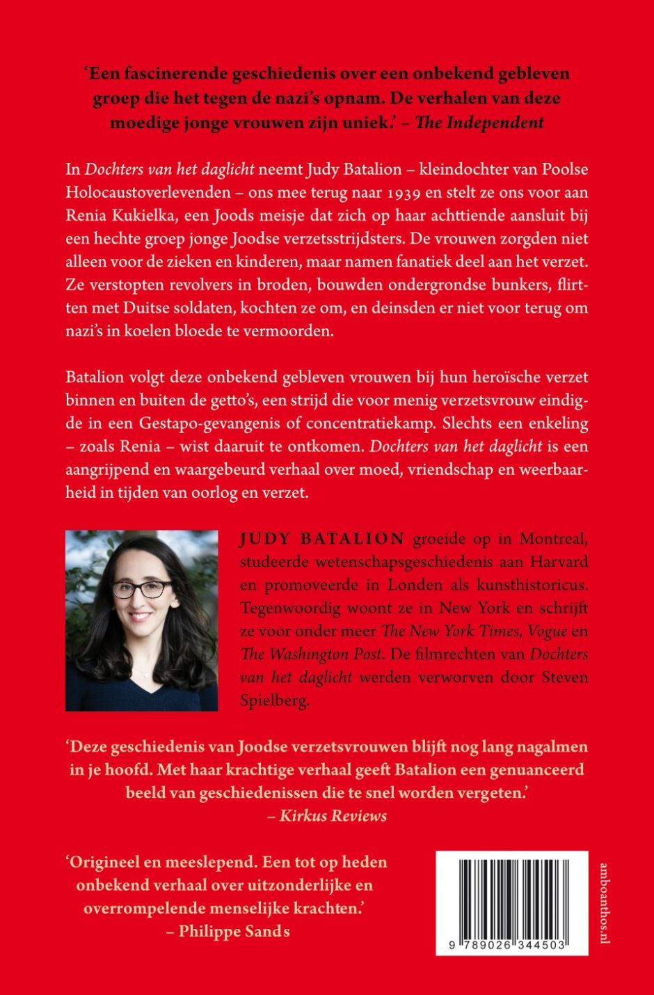 In Dochters van het daglicht brengt Batalion al deze indrukwekkende verhalen samen in een magistraal en meeslepend historisch epos. Middelpunt vormt de hechte verzetsgroep rond de achttienjarige Poolse Renia Kukielka, die haar leven zonder aarzeling in de waagschaal stelt om Hitler te verslaan. Met centrale thema’s als vrouwenverzet, vriendschap en feminisme in oorlogstijd is Dochters van het daglicht van Judy Batalion een boek dat geen lezer onberoerd zal laten.