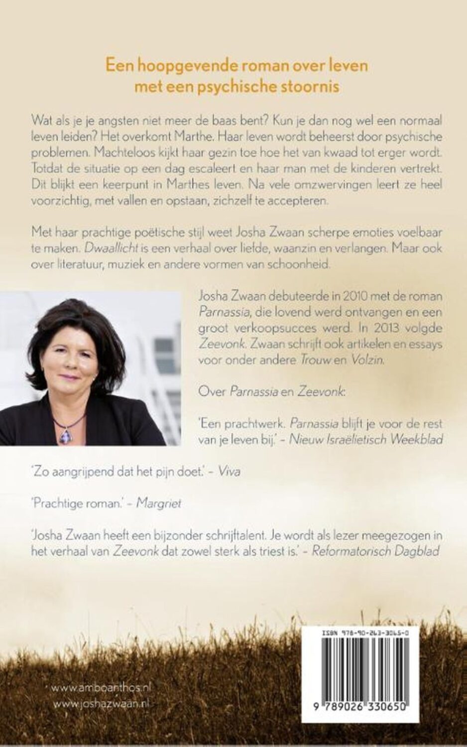 Josha Zwaans hoopgevende roman 'Dwaallicht' gaat over leven met een psychische stoornis. In 'Dwaallicht' wordt Marthes leven beheerst door angsten en wanen. Haar man Barend kijkt machteloos toe en hun kinderen zorgen inmiddels meer voor hun moeder dan zij voor hen. Tijdens een vakantie escaleert de situatie en Barend vertrekt met de kinderen. Marthe belandt in een psychose en zwerft wekenlang door Amsterdam. Heel voorzichtig leert ze zichzelf te accepteren en een sprankje zelfvertrouwen groeit. Maar past zij nog in het leven van haar gezin?