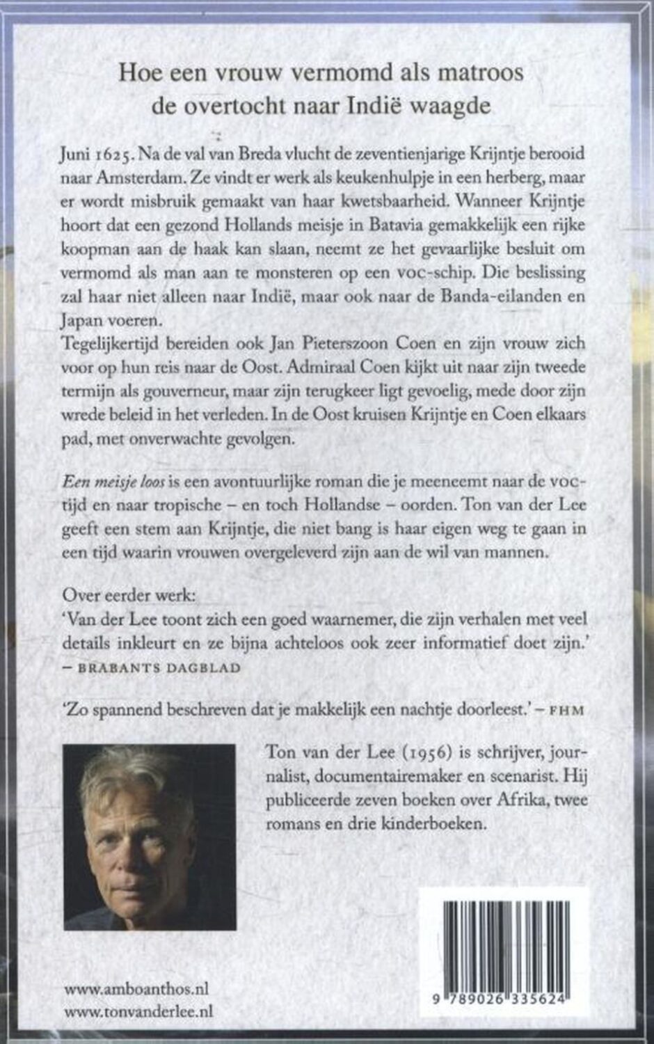 ‘Een meisje loos’ van Ton van der Lee, auteur van de bestseller ‘Solitaire’, is een spannende historische roman over vrouwen die in de zeventiende eeuw vermomd als matroos de overtocht naar Indië waagden. Voor de liefhebbers van ‘Nachtblauw’, ‘Roeien naar de Volewijck’ en ‘Tulpenliefde’. Na de Bredase capitulatie weet Krijntje de stad ternauwernood te ontvluchten. In Amsterdam vindt ze werk als keukenhulpje, maar het logement van haar bazin blijkt geen nette herberg. Krijntje ziet haar kans schoon als ze hoort over het gebrek aan huwbare vrouwen in Batavia. Om haar droom te kunnen verwezenlijken en aan het benauwende Nederland te ontsnappen besluit ze vermomd als man aan te monsteren op een VOC-schip. Tegelijkertijd bereiden ook Jan Pieterszoon Coen en zijn vrouw zich voor op hun reis naar de Oost. Ton van der Lee publiceerde eerder zeven boeken over Afrika, een roman en drie kinderboeken.