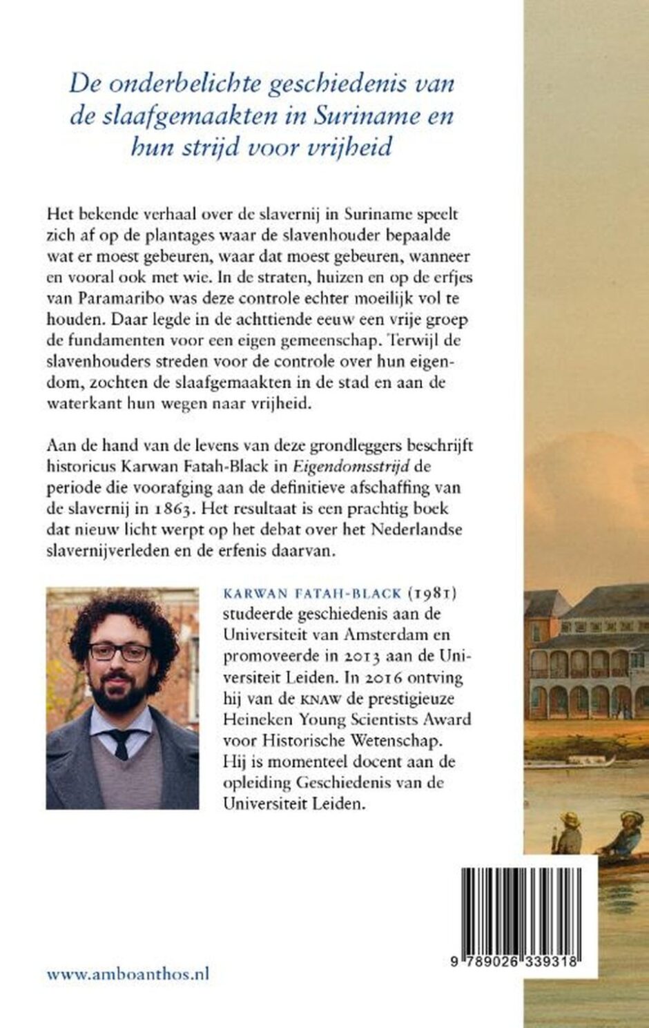 In de straten, huizen en erfjes van Paramaribo was de controle van de slavenhouder moeilijk vol te houden. Daar begon een vrije groep de fundamenten van een eigen gemeenschap te leggen. Terwijl de slavenhouders streden voor de controle over hun eigendom, zochten in de stad en aan de waterkant de slaven hun wegen naar vrijheid. Aan de hand van de levens van deze grondleggers beschrijft Karwan Fatah-Black in ‘Eigendomsstrijd’ de periode die voorafging aan de definitieve afschaffing van de slavernij in 1863. Het resultaat is een prachtig boek dat nieuw licht werpt op het Nederlandse slavernijverleden en de erfenis daarvan.