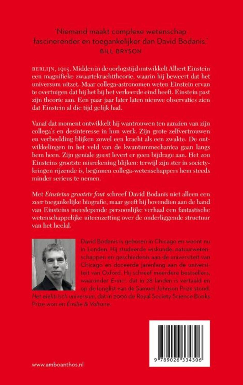 David Bodanis (o.a. auteur van de bestsellers ‘E=mc2’, ‘Het elektrisch universum’ en ‘Emilie & Voltaire’) beschrijft in ‘Einsteins grootste fout — Het leven van een feilbaar genie’ hoe het succes van Einsteins grootste prestatie leidde tot zijn grootste mislukking. Berlijn, 1915. In hartje oorlogstijd ontwikkelt Albert Einstein een magnifieke zwaartekrachttheorie, waarin hij beweert dat het universum uitzet. Collega-astronomen overtuigen Einstein zijn theorie aan te passen, hoewel een paar jaar later blijkt dat hij al die tijd gelijk heeft gehad. Vanaf dat moment ontwikkelt hij een koppig wantrouwen tegenover zijn collega’s. Het zou zijn grootste misrekening zijn: terwijl zijn ster in societykringen stijgt, beginnen collega-wetenschappers hem steeds minder serieus te nemen. ‘Einsteins grootste fout’ is een zeer toegankelijke intellectuele biografie en — verteld aan de hand van Einsteins meeslepende persoonlijke verhaal —een fantastische wetenschappelijke uiteenzetting van de onderliggende structuur van het heelal.