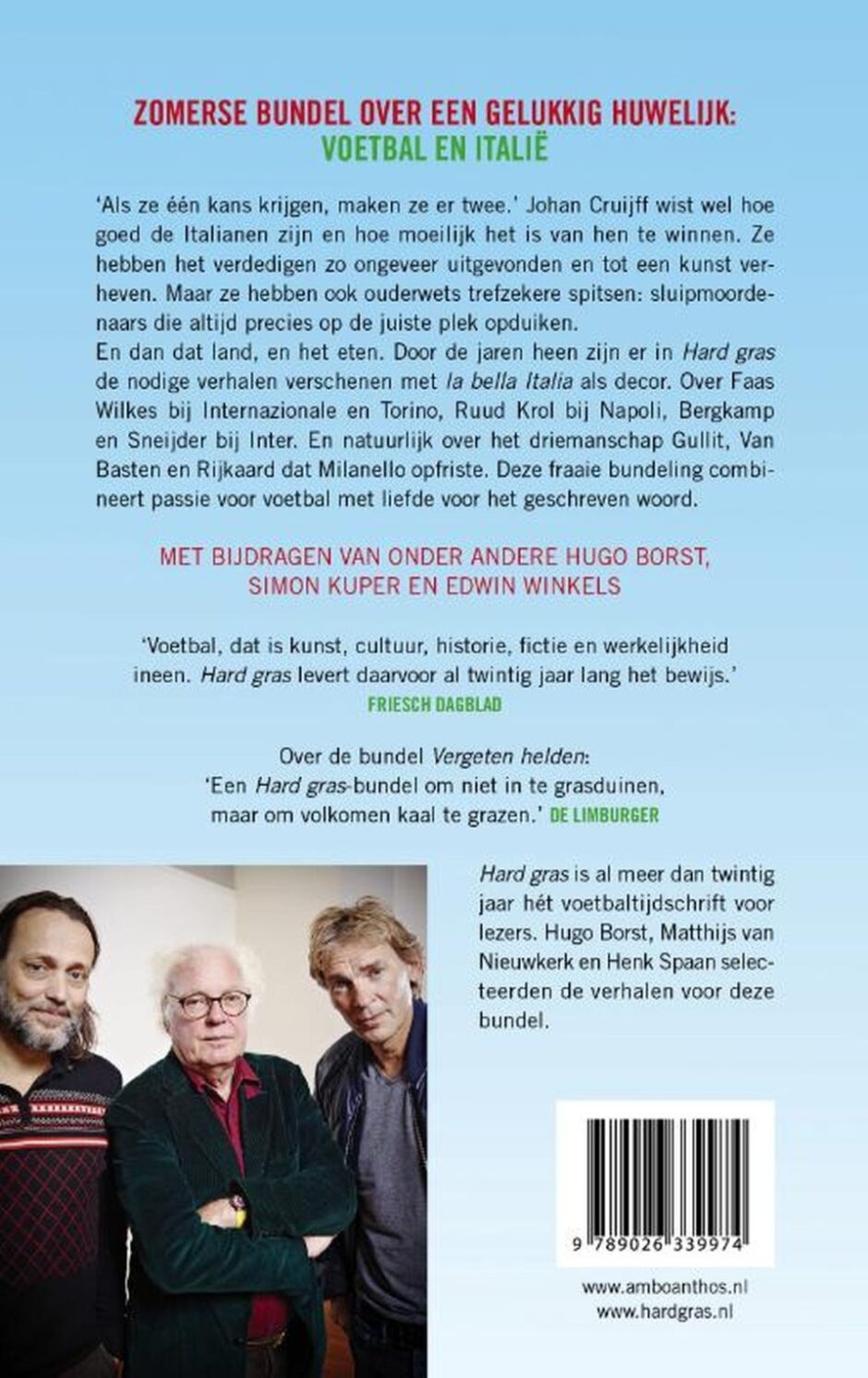 En dan dat land, en het eten. Door de jaren heen zijn er de nodige verhalen in Hard gras verschenen met la bella Italia als decor. Over Faas Wilkes bij Internazionale en Torino, Ruud Krol bij Napoli, Bergkamp en Sneijder bij Inter. En natuurlijk over het driemanschap Gullit, Van Basten en Rijkaard dat Milanello opfriste. Deze fraaie bundeling combineert passie voor voetbal met liefde voor het geschreven woord.
