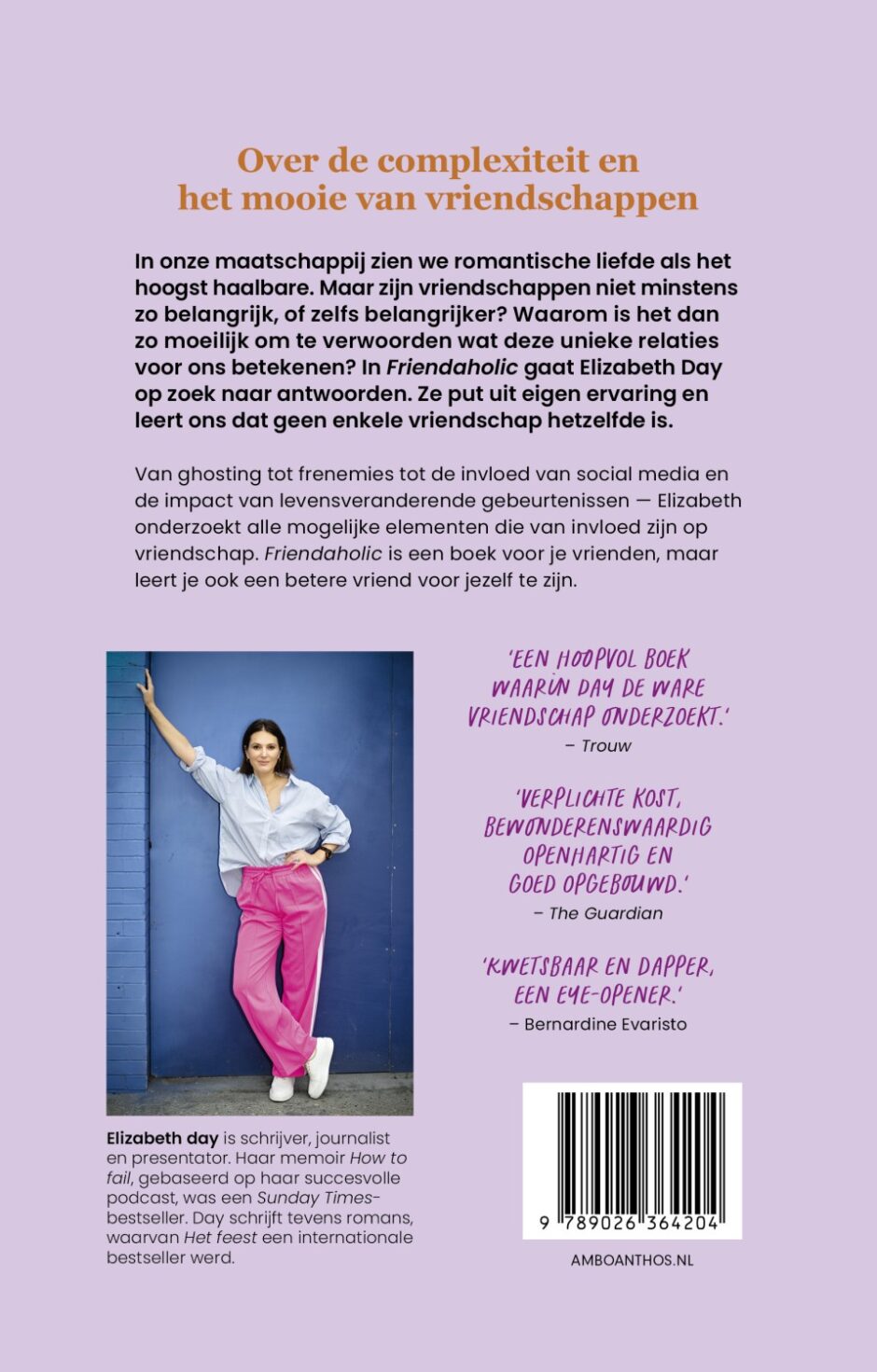 In Friendaholic gaat Elizabeth Day op zoek naar antwoorden. Ze put uit eigen ervaring en leert ons dat geen enkele vriendschap hetzelfde is. Van ghosting tot frenemies tot de invloed van social media en de impact van levensveranderende gebeurtenissen — Elizabeth onderzoekt alle mogelijke elementen die van invloed zijn op vriendschap.