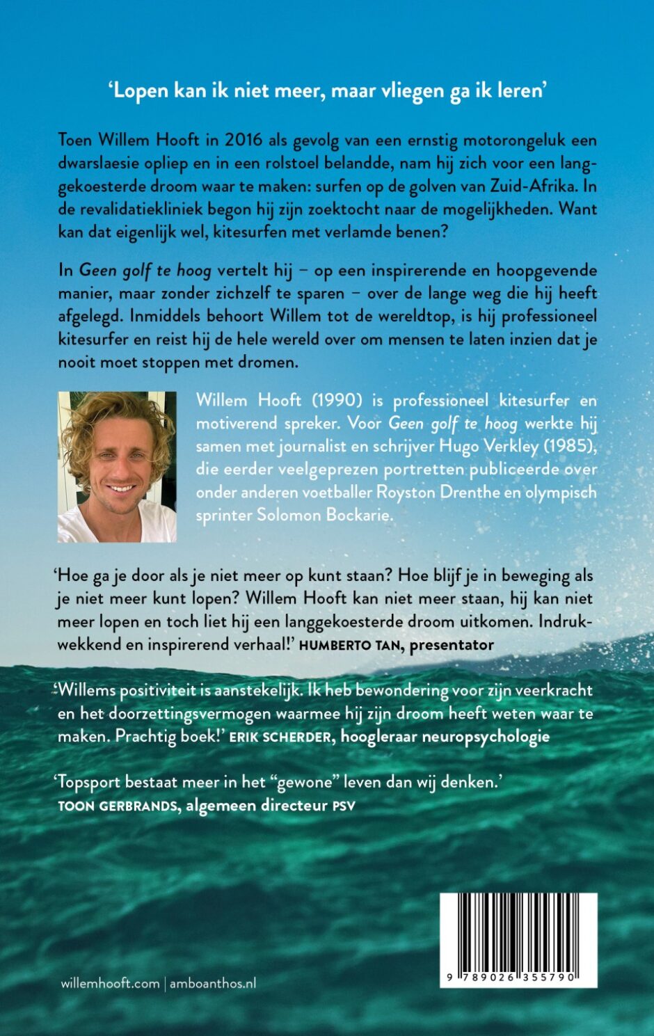 In Geen golf te hoog vertelt hij – op een inspirerende en hoopgevende manier, maar zonder zichzelf te sparen – over de lange weg die hij heeft afgelegd. Inmiddels behoort Willem tot de wereldtop, is hij professioneel kitesurfer en reist hij de hele wereld over om mensen te laten inzien dat je nooit moet stoppen met dromen.