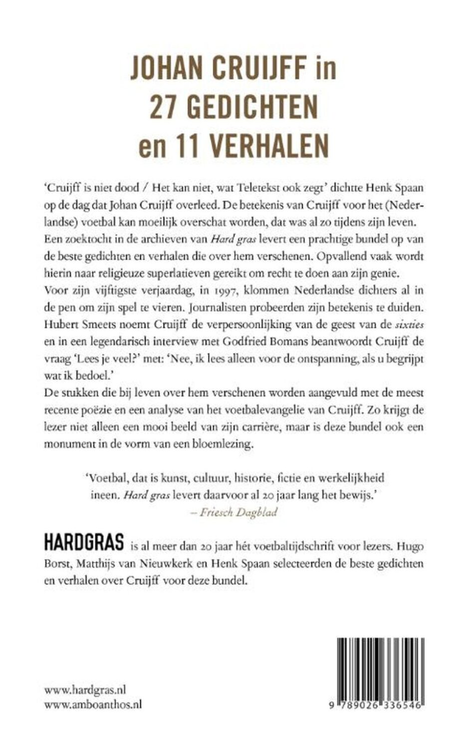 De stukken die over hem bij leven verschenen worden aangevuld met de meest recente poëzie over hem en een analyse van het voetbalevangelie van Cruijff door David Winner uit de laatste Hard gras. Zo levert deze bundel niet alleen een mooi historisch beeld van zijn carrière, maar ook een monument in de vorm van een bloemlezing.