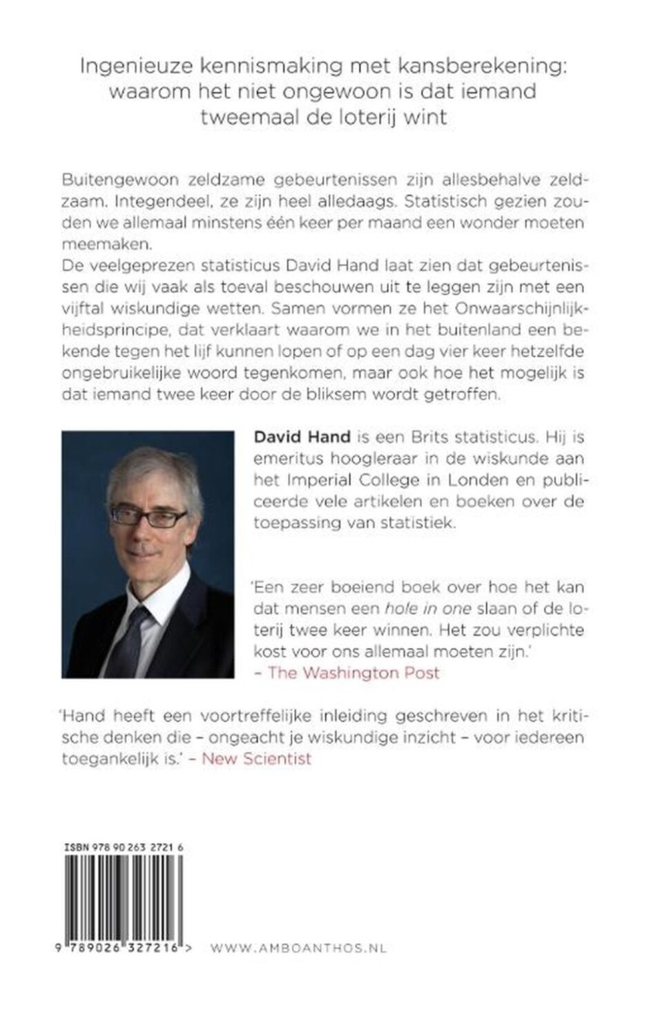 David Hand is een meester in het toegankelijk maken van statistiek en kansberekening. Hij laat de lezer kennismaken met het onwaarschijnlijkheidsprincipe, dat verklaart waarom we in het buitenland een bekende tegen het lijf kunnen lopen of op een dag vier keer hetzelfde ongebruikelijke woord tegenkomen, maar ook hoe het mogelijk is dat iemand twee keer de loterij wint of meermalen door de bliksem wordt getroffen en nog steeds leeft.