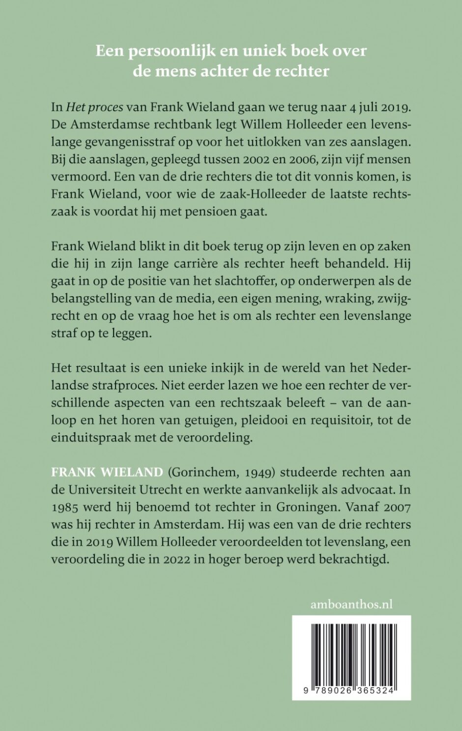 In Het proces blikt Frank Wieland terug op zijn leven en op zaken die hij in zijn lange carrière als rechter heeft behandeld. Hij gaat in op de positie van het slachtoffer, op onderwerpen als de belangstelling van de media, een eigen mening, wraking, zwijgrecht en op de vraag hoe het is om als rechter een levenslange straf op te leggen.