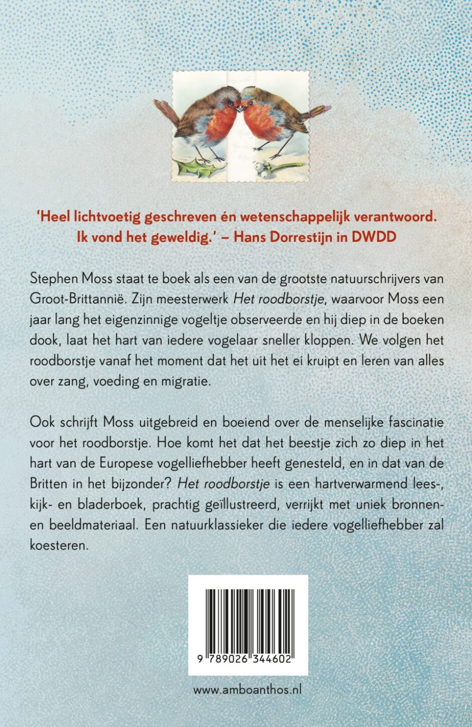 Moss' kleine meesterwerk, waarvoor de auteur een jaar lang het roodborstje observeerde en diep in de boeken dook, laat het hart van iedere vogelaar sneller kloppen. We volgen het roodborstje vanaf het moment dat het uit zijn ei kruipt en leren van alles over zang, voeding en migratie. Moss schrijft daarnaast boeiend over de menselijke fascinatie voor het roodborstje. Hoe komt het dat het beestje zich zo diep in het hart van de Europese vogelliefhebber heeft genesteld, en die van de Britten in het bijzonder?