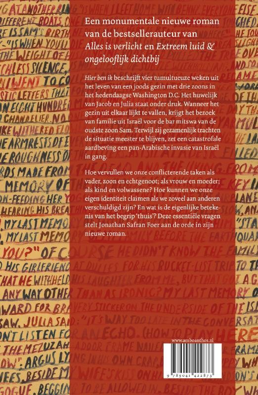 Hier ben ik beschrijft drie tumultueuze weken uit het getroebleerde leven van een familie in het hedendaagse Washington D.C. Terwijl Jacob, Julia en hun drie zonen zich onontkoombaar geconfronteerd zien met het verschil tussen hun dromen en de werkelijkheid, zet een catastrofale aardbeving een pan-Arabische invasie van Israël in gang. De eigenlijke betekenis van het begrip ‘thuis’ staat ter discussie – evenals de fundamentele vraag hoeveel iemand in zijn leven kan verdragen.
