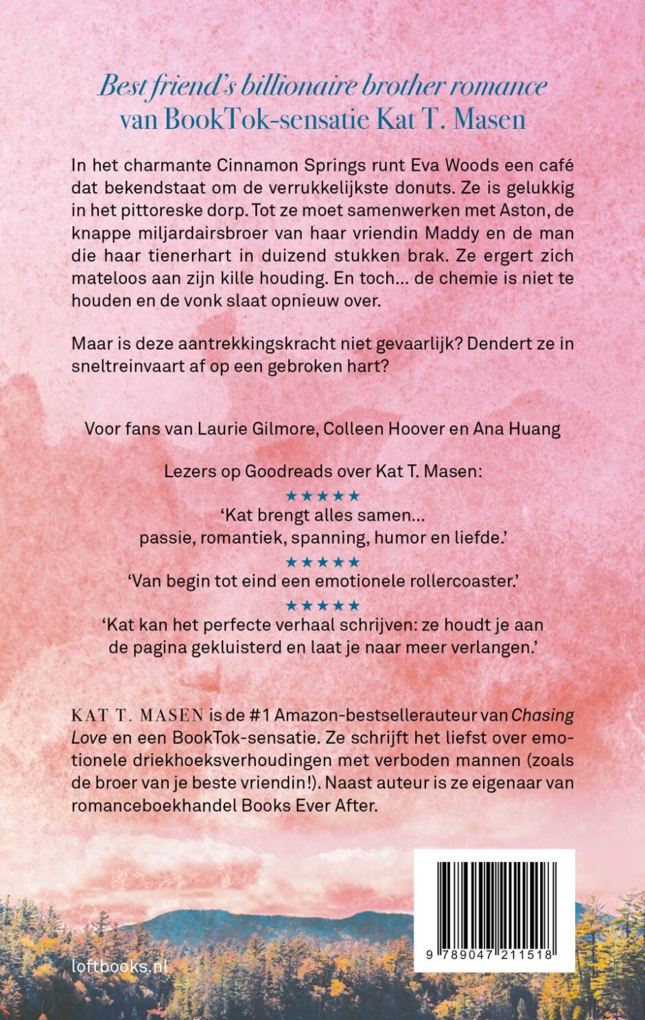 Voor lezers van Colleen Hoover, Laurie Gilmore en Ana Huang.In het charmante Cinnamon Springs runt Eva Woods een café dat bekendstaat om de verrukkelijkste donuts. Ze is gelukkig en gesetteld in het pittoreske dorpsleven. Tot ze moet samenwerken met Aston, de knappe miljardairsbroer van haar vriendin Maddy – en de man die haar tienerhart in duizend stukken brak. Ze ergert zich mateloos aan zijn kille rigide houding. En toch… de chemie is niet te houden en de vonken slaan alweer over.