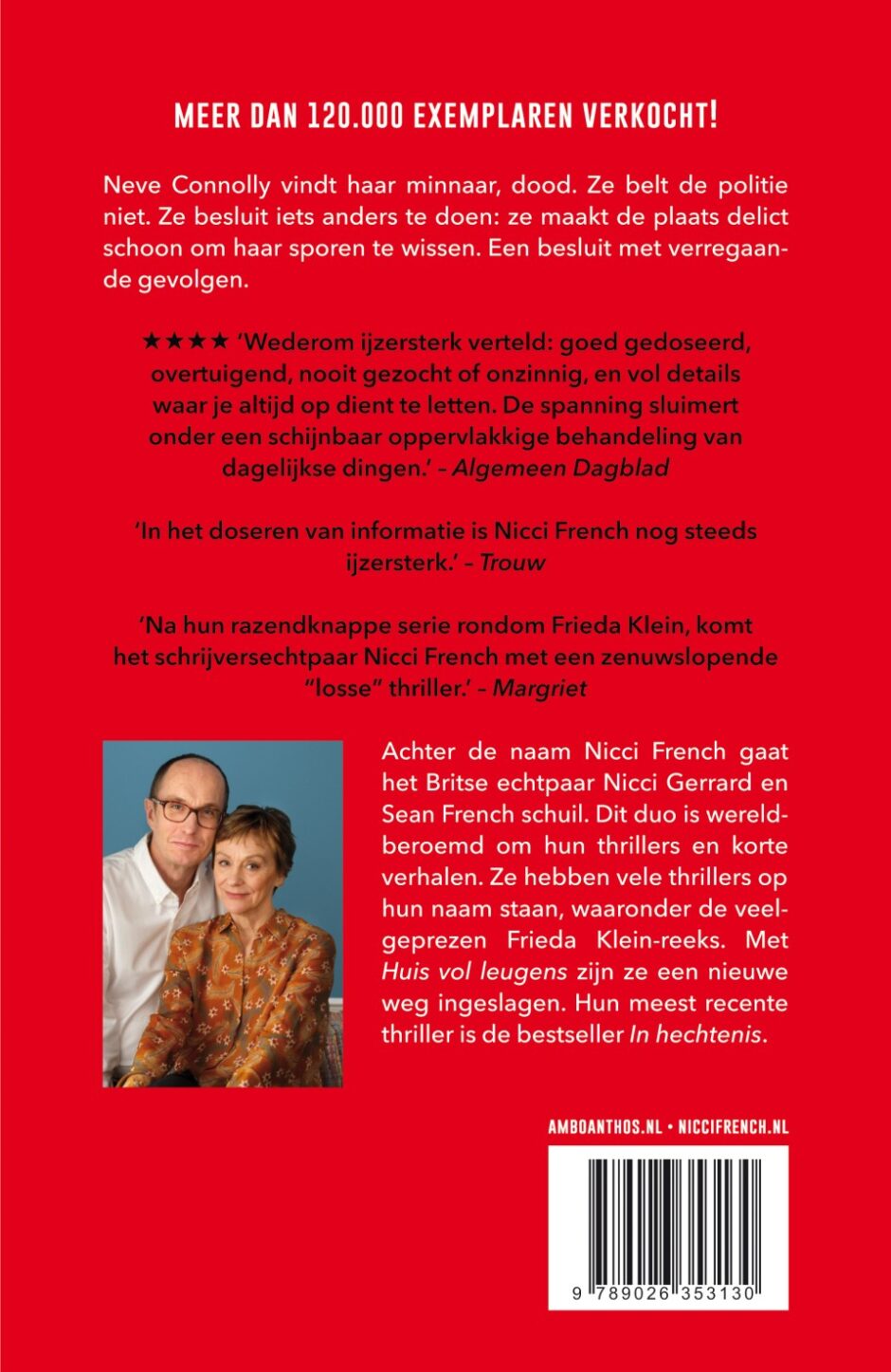 In Huis vol leugens van Nicci French leidt de vijfenveertigjarige Neve een ogenschijnlijk gelukkig leven, met haar echtgenoot en drie kinderen. Schijn bedriegt, want ze heeft een affaire met een getrouwde man. Ze spreken regelmatig af in zijn pied-à-terre in Londen. Op een dag krijgt Neve een berichtje dat ze naar het appartement moet komen en ze treft daar haar minnaar dood aan; zijn schedel is ingeslagen. In paniek begaat ze een grote fout: ze maakt de plaats delict schoon, zodat het lijkt alsof ze er nooit geweest is. Ze wil niet dat haar affaire aan het licht komt. Maar daarna heeft ze geen keus: ze moet blijven liegen. Tegen haar gezin, haar collega’s en haar vrienden. En dan blijkt dat iedereen wel iets te verbergen heeft…
