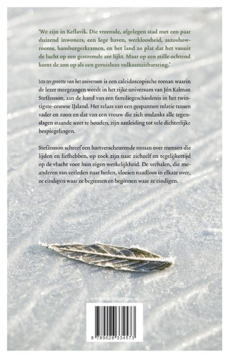 ‘Iets ter grootte van het universum’ is een caleidoscopische roman waarin de lezer meegezogen wordt in het rijke universum van Stefánsson, aan de hand van een familiegeschiedenis in het twintigste-eeuwse IJsland. Het relaas van een gespannen relatie tussen vader en zoon en dat van een vrouw die zich ondanks alle tegenslagen staande weet te houden, zijn aanleiding tot vele dichterlijke bespiegelingen. Hoe onvoorwaardelijk moet liefde eigenlijk zijn? En zijn onze gevoelens niet altijd een weerspiegeling van het hele universum? In zijn meanderende verteltrant schetst de auteur een onvergetelijk beeld van een familie.