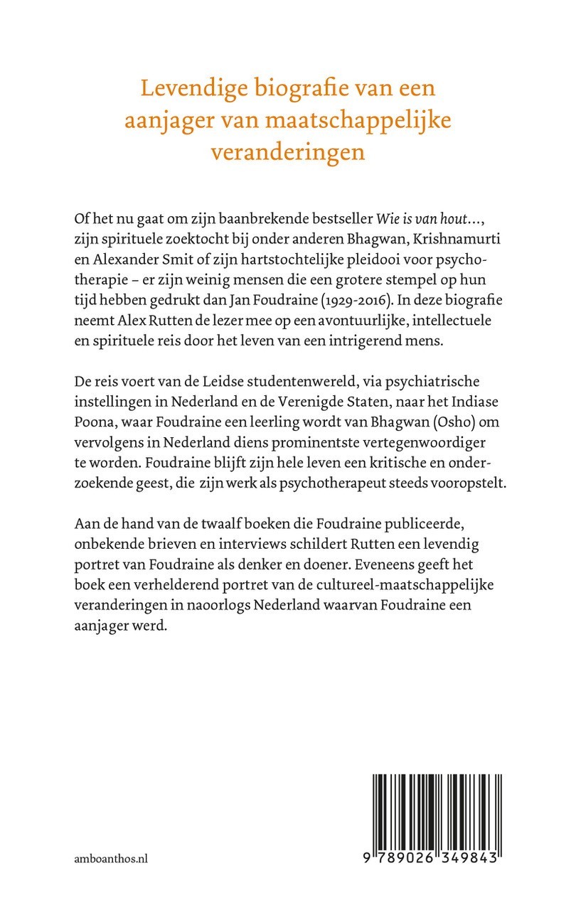 (Osho), Krishnamurti en Alexander Smit of zijn hartstochtelijke pleidooi voor psychotherapie – er zijn weinig mensen die een grotere stempel op hun tijd hebben gedrukt dan Jan Foudraine (1929-2016). In dit meeslepend geschreven boek neemt biograaf Alex Rutten de lezer mee op een avontuurlijke, intellectuele en spirituele reis door het leven van een intrigerend mens. De reis voert van de Leidse studentenwereld, via psychiatrische instellingen in Nederland en de Verenigde Staten, naar het Indiase Poona, waar Foudraine een leerling wordt van Bhagwan (Osho) om vervolgens in Nederland diens prominentste vertegenwoordiger te worden. Het grote publiek ziet in Foudraine een held, de pers een charlatan. Foudraine zelf blijft ondertussen de onderzoekende en kritische geest die hij altijd is geweest, waarbij zijn werk als psychotherapeut steeds voorop staat.