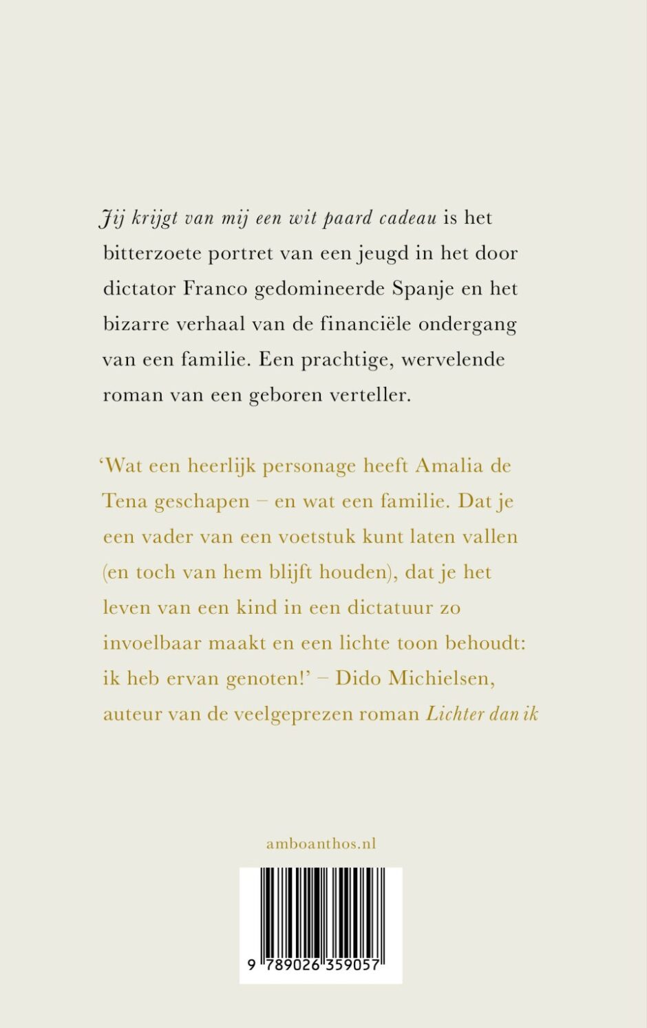 Jij krijgt van mij een wit paard cadeau van Amalia de Tena is het bitterzoete portret van een jeugd in het door dictator Franco gedomineerde Spanje en het bizarre verhaal van de financiële ondergang van een familie. Gebaseerd op de familiegeschiedenis van de auteur. Voor de lezers van Judith Fanto en Isabel Allende.