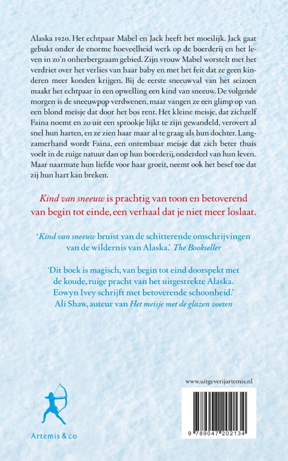 Alaska 1920. Mabel en Jack hebben het zwaar. Jack gaat gebukt onder de enorme hoeveelheid werk op de boerderij en Mabel worstelt met de eenzaamheid en het verdriet over het feit dat zij geen kinderen kunnen krijgen. Bij de eerste sneeuwval van het seizoen bouwt het echtpaar in een opwelling een kleine sneeuwpop. De volgende morgen is het sneeuwkind verdwenen, maar plotseling vangen ze een glimp op van een blond meisje dat door het bos rent. Het kleine meisje, dat zichzelf Faina noemt en zo uit een sprookje lijkt te zijn gewandeld, verovert al snel Jack en Mabel's hart. Ze zien haar maar al te graag als hun dochter. Maar in Alaska zijn leven en dood onvermijdelijk met elkaar verbonden. Wat het echtpaar van Faina leert verandert hun leven voor goed.