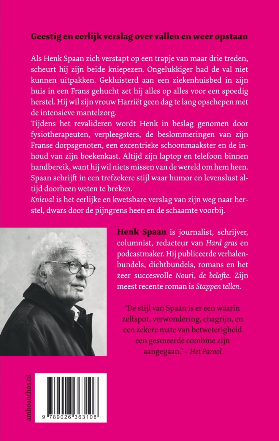 Begin februari 2021. Henk wil nog even een jas pakken en in de auto leggen, zodat hij samen met zijn vrouw Harriët de volgende dag vanuit zijn huis in Frankrijk naar Nederland kan rijden. Maar dan verstapt hij zich op een trapje met maar drie treden. Hij komt akelig terecht op zijn linkerknie en als hij wil opstaan, valt hij keihard op de rechterknie. Lang verhaal kort: twee gescheurde kniepezen. Henk Spaan is midden in coronatijd opeens aan een ziekenhuisbed in de woonkamer gekluisterd. Van zijn fysiotherapeut moet hij dagelijks door de pijngrens heen. Veel nare klussen rusten op de schouders van Harriët. Het herstel kan haar niet snel genoeg gaan en dat geldt ook voor Henk, die dagelijks een flinke dosis schaamte moet overwinnen.