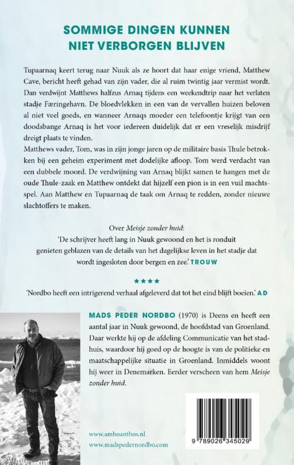 Mads Peder Nordbo (1970) is Deens en woonde een aantal jaar in Nuuk, de hoofdstad van Groenland. Daar werkte hij op de afdeling Communicatie van het stadhuis, waardoor hij goed op de hoogte is van de politieke en maatschappelijke situatie in Groenland. Inmiddels woont hij weer in Kopenhagen. Eerder verschenen van hem Meisje zonder huid en Koude angst.
