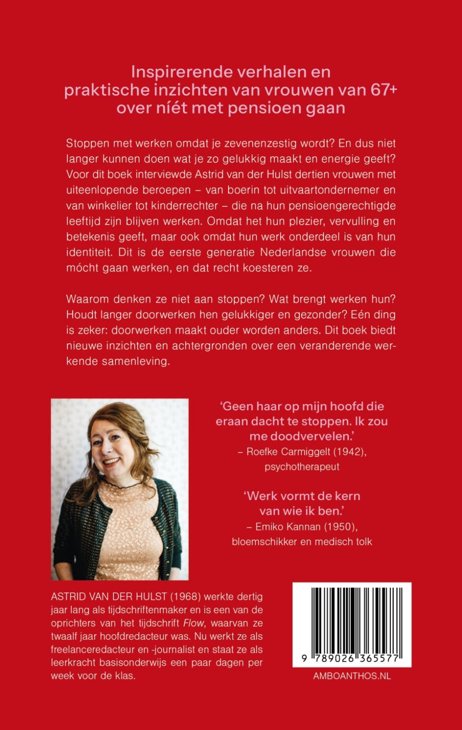 Voor dit boek interviewde Astrid van der Hulst dertien vrouwen met uiteenlopende beroepen – van boerin tot uitvaartondernemer en van winkelier tot kinderrechter - die na hun pensioengerechtigde leeftijd zijn blijven werken. Omdat het hun plezier, vervulling en betekenis geeft, maar ook omdat werken onderdeel is van hun identiteit.