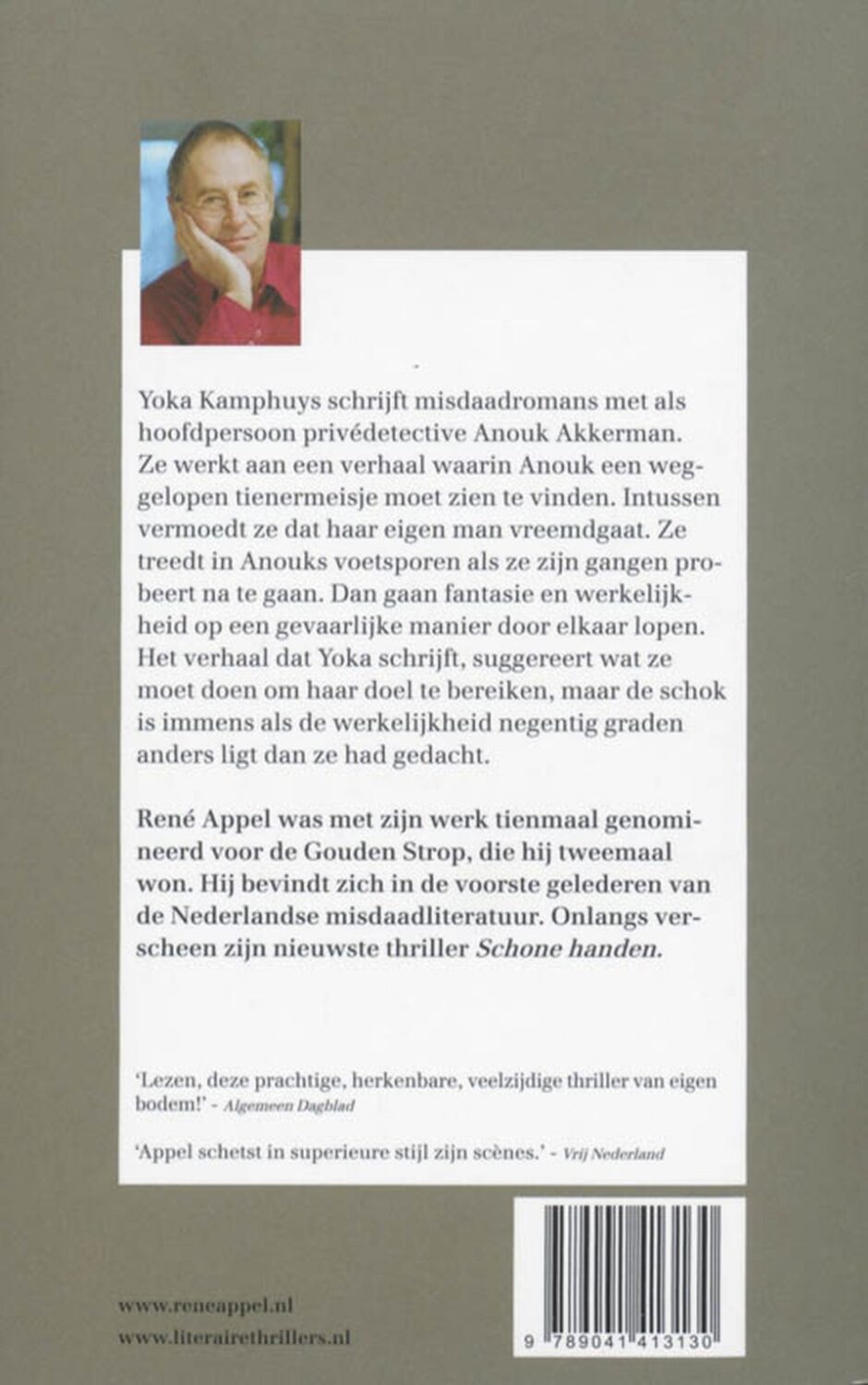Wat doet een vrouw die vermoedt dat haar man een affaire heeft met een andere vrouw? Yoka Kamphuis is gewend over dit soort vragen na te denken. Ze schrijft namelijk misdaadromans met als hoofdpersoon privé-detective Anouk Akkerman. Yoka werkt aan een verhaal waarin Anouk een weggelopen tienermeisje moet zien te vinden. Intussen vermoedt ze dat haar eigen man vreemdgaat. Ze treedt in Anouks voetsporen als ze zijn gangen probeert na te gaan. Dan beginnen fantasie en werkelijkheid op een gevaarlijke manier door elkaar te lopen. Het verhaal dat Yoka schrijft suggereert wat ze moet doen om haar doel te bereiken, maar de schok is immens als de werkelijkheid negentig graden anders ligt dan ze had gedacht.