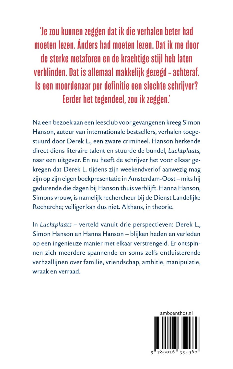 Na een bezoek aan eenleesclub voor gevangenen krijgt Simon Hanson, auteur van internationale bestsellers, verhalen van de zware crimineel Derek L. toegestuurd. Hanson herkent direct diens literaire talent en stuurt de bundel, Luchtplaats, naar een uitgever. En nu heeft de schrijver het voor elkaar gekregen dat Derek L. tijdens zijn weekendverlof aanwezig mag zijn op zijn eigen boekpresentatie in Amsterdam-Oost – mits hij gedurende die dagen bij Hanson thuis verblijft. Hanna Hanson, Simons vrouw, is namelijk rechercheur zware en georganiseerde criminaliteit; veiliger kan dus niet. Althans, in theorie.