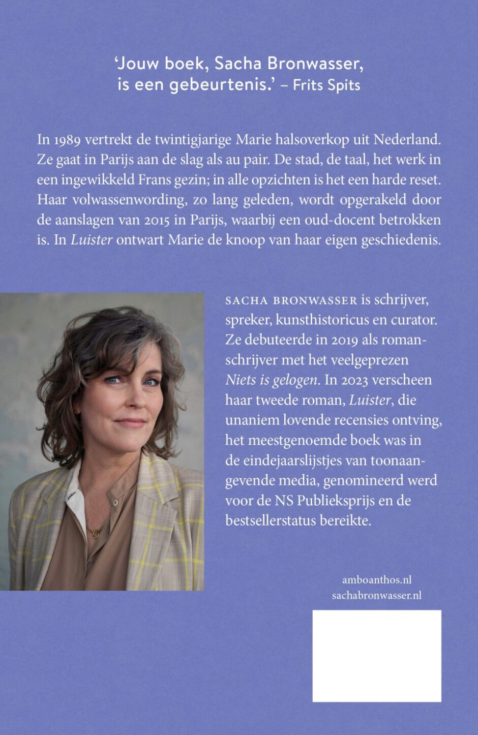 Sacha Bronwasser is schrijver, spreker, kunsthistoricus en curator, in wisselende volgorde. Ze debuteerde als romanschrijver in oktober 2019 met het veelgeprezen Niets is gelogen. In februari 2023 verscheen haar tweede roman Luister. Opnieuw werd het boek unaniem lovend besproken en eindigde het hoog in de eindejaarslijstjes van toonaangevende media. Van Luister zijn inmiddels meer dan 60.000 exemplaren verkocht.