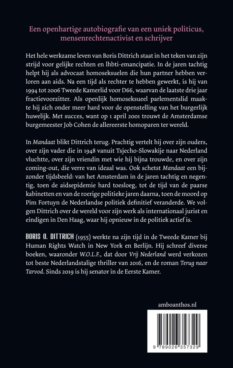 In Mandaat blikt Dittrich terug. Prachtig vertelt hij over zijn ouders, over zijn vader die in 1948 vanuit Tsjecho-Slowakije naar Nederland vluchtte, over zijn vriendin met wie hij bijna trouwde, en over zijn coming-out, die verre van ideaal was. Ook schetst Mandaat een bijzonder tijdsbeeld: van het Amsterdam in de jaren tachtig en negentig, toen de aidsepidemie hard toesloeg, tot de tijd van de paarse kabinetten en van de roerige politieke jaren daarna, toen de moord op Pim Fortuyn de Nederlandse politiek defi nitief veranderde. We volgen Dittrich over de wereld voor zijn werk als internationaal jurist en eindigen in Den Haag, waar hij opnieuw in de politiek actief is.