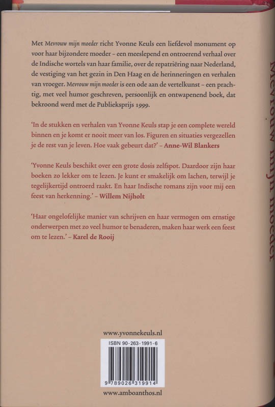 Met Mevrouw mijn moeder richt Yvonne Keuls een liefdevol monument op voor haar bijzondere moeder ;Het is een meeslepend en ontroerend verhaal over de Indische wortels van haar familie, over de repatriering naar Nederland, de vestiging in Den Haag en de herinneringen en verhalen van vroeger. Mevrouw mijn moeder is een prachtig en humorvol geschreven, persoonlijk en ontwapenend boek. Een ode aan de vertelkunst - Yvonne Keuls op haar best
