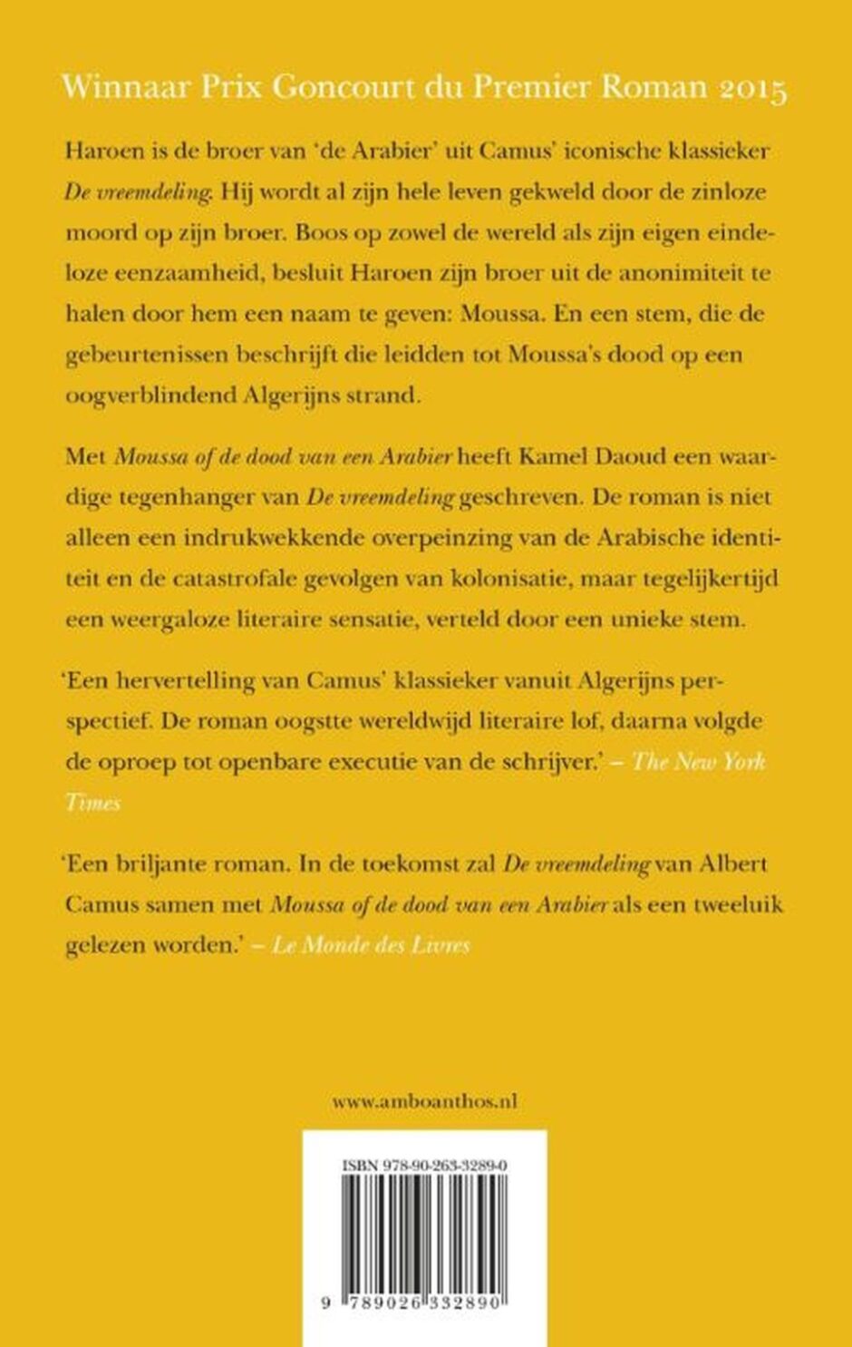 Met Moussa of de dood van een Arabier heeft Kamel Daoud een stem gegeven aan ‘de Arabier’ uit de Franse klassieker De vreemdeling van Albert Camus. Haroen wordt al zijn hele leven gekweld door de zinloze moord op zijn broer door Meursault, de beruchte antiheld uit Camus’ roman. Haroen besluit zijn broer uit de anonimiteit te halen door hem een naam te geven: Moussa. En een stem, die de gebeurtenissen beschrijft die leidden tot Moussa’s dood op een oogverblindend Algerijns strand. De roman Moussa of de dood van een Arabier is tegelijkertijd een liefdesverklaring aan en overpeinzing van de Arabische identiteit, waarin het kolonialisme en de druk van het geloof een grote rol spelen. Kamel Daoud won met Moussa of de dood van een Arabier de Prix Goncourt du Premier Roman 2015.