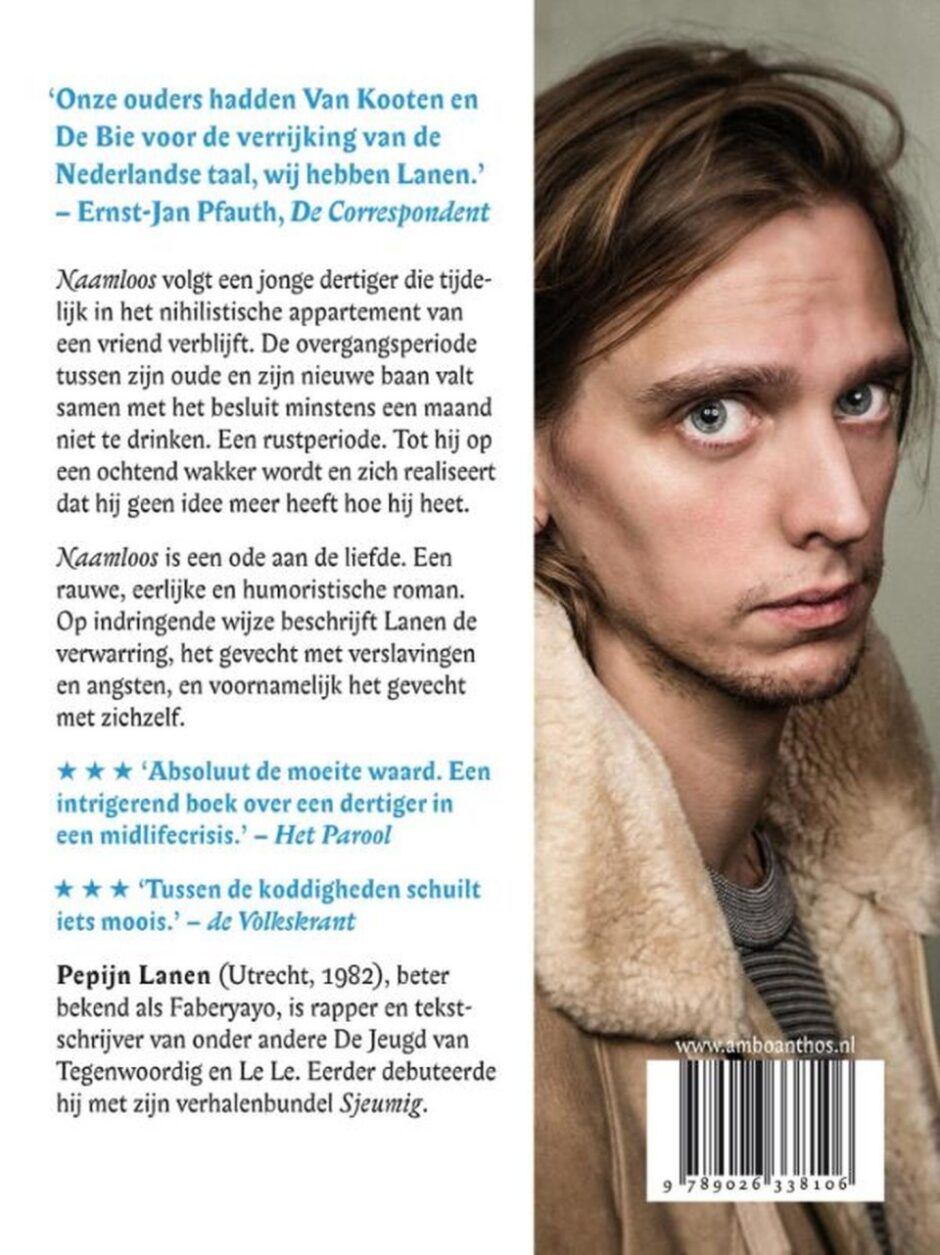 ‘Het begint met dat ik mijn naam niet meer kan herinneren.’ Zo opent de roman van Pepijn Lanen, waarin we een aantal weken uit het leven van een naamloze jongeman volgen. Een dertiger die tussen twee banen in zit en tijdelijk verblijft in een nihilistisch appartement van een vriend. Op indringende manier leeft de lezer mee met zijn verwarring, zijn gevecht met verslavingen en angsten, en voornamelijk het gevecht met zichzelf. Pepijn Lanen schreef met Naamloos een rauw, eerlijk en humoristisch boek over het leven en de liefde. Voor de lezers van Hallo muur, Brusselmans en Bukowski.