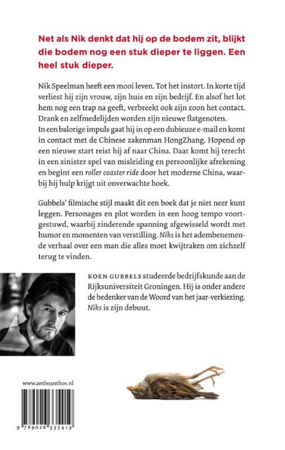 ‘Niks’ van Koen Gubbels is een verontrustende thriller over een man in een midlifecrisis en de sinistere wereld van de orgaanhandel. Na zijn scheiding raakt Nik aan lager wal. In korte tijd lijkt hij alles te verliezen; zijn vrouw, zijn huis en zijn bedrijf. Ook verbreekt zijn zoon alle contact. In een balorige impuls gaat hij in op een e-mailscam en komt in contact met een Chinese zakenman. Hopend op een nieuwe start reist Nik af naar China, waar hij terechtkomt in een duister spel van misleiding en persoonlijke afrekeningen. Hiermee begint een avontuur waarbij hij hulp krijgt uit onverwachte hoek. Koen Gubbels’ filmische stijl maakt ‘Niks’ onneerlegbaar. De zinderende spanning wordt afgewisseld met humor en momenten van verstilling. ‘Niks’ is het adembenemende verhaal over een man die alles kwijtraakt maar daardoor zichzelf terugvindt.